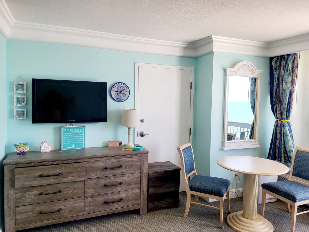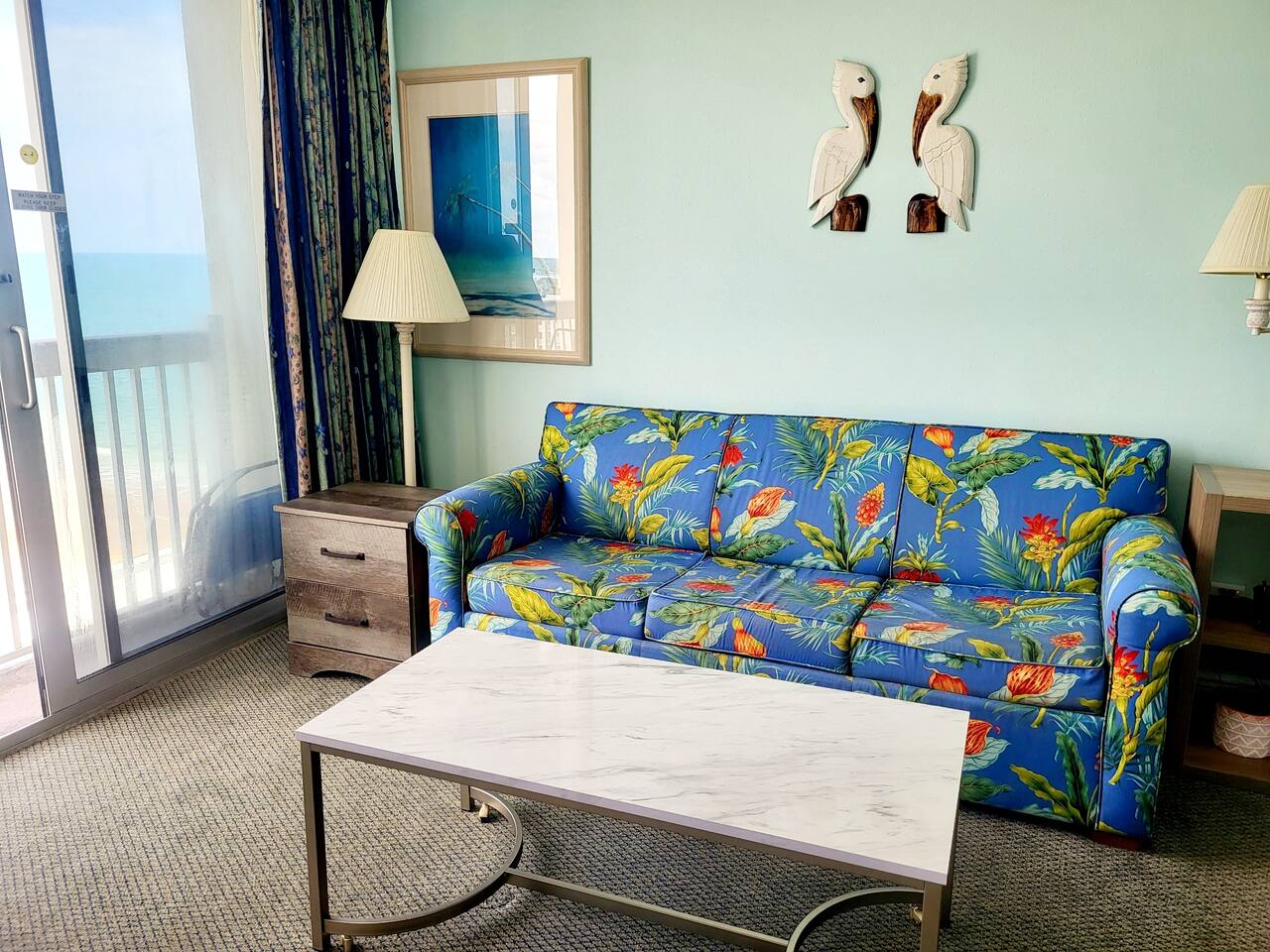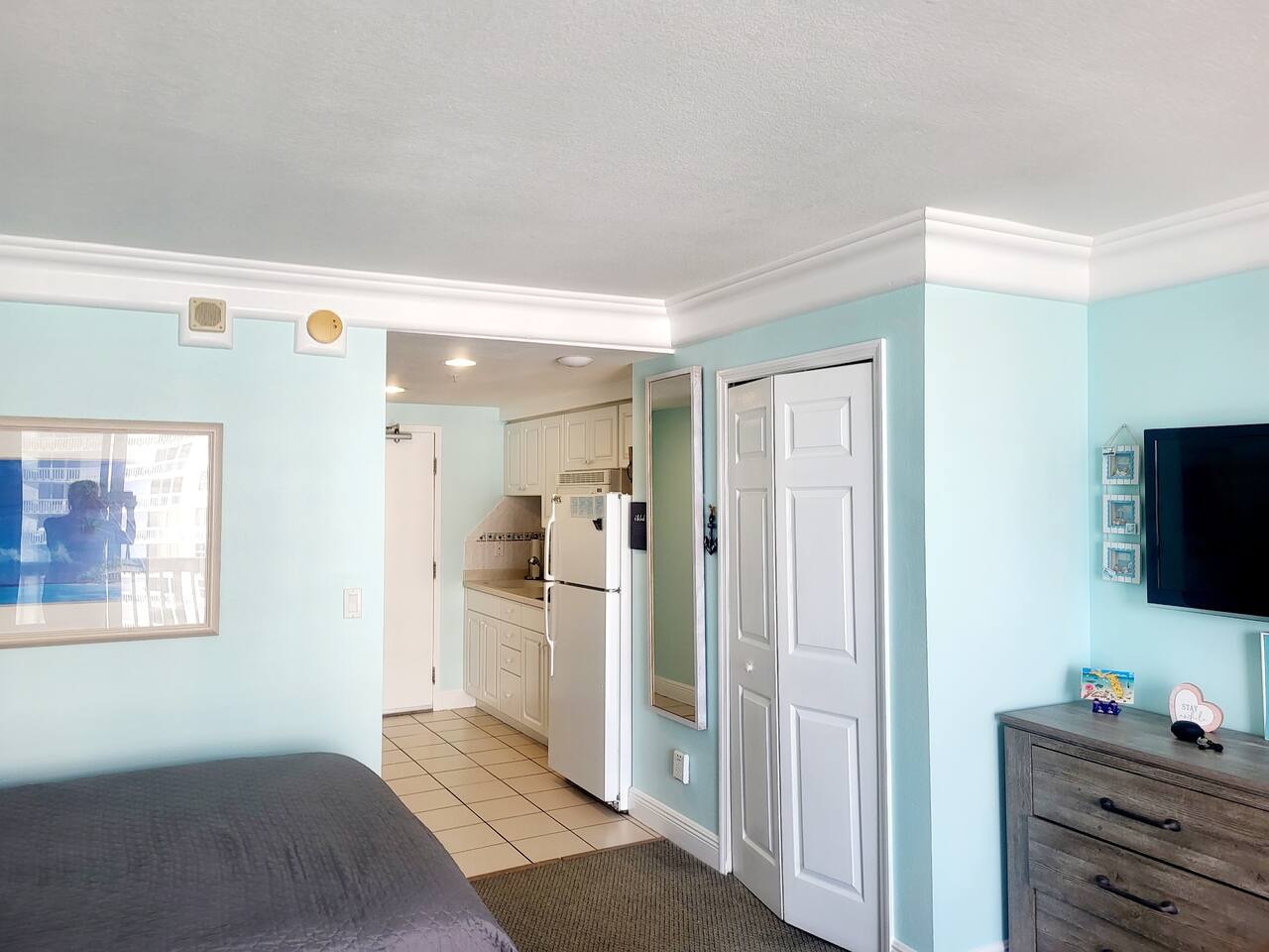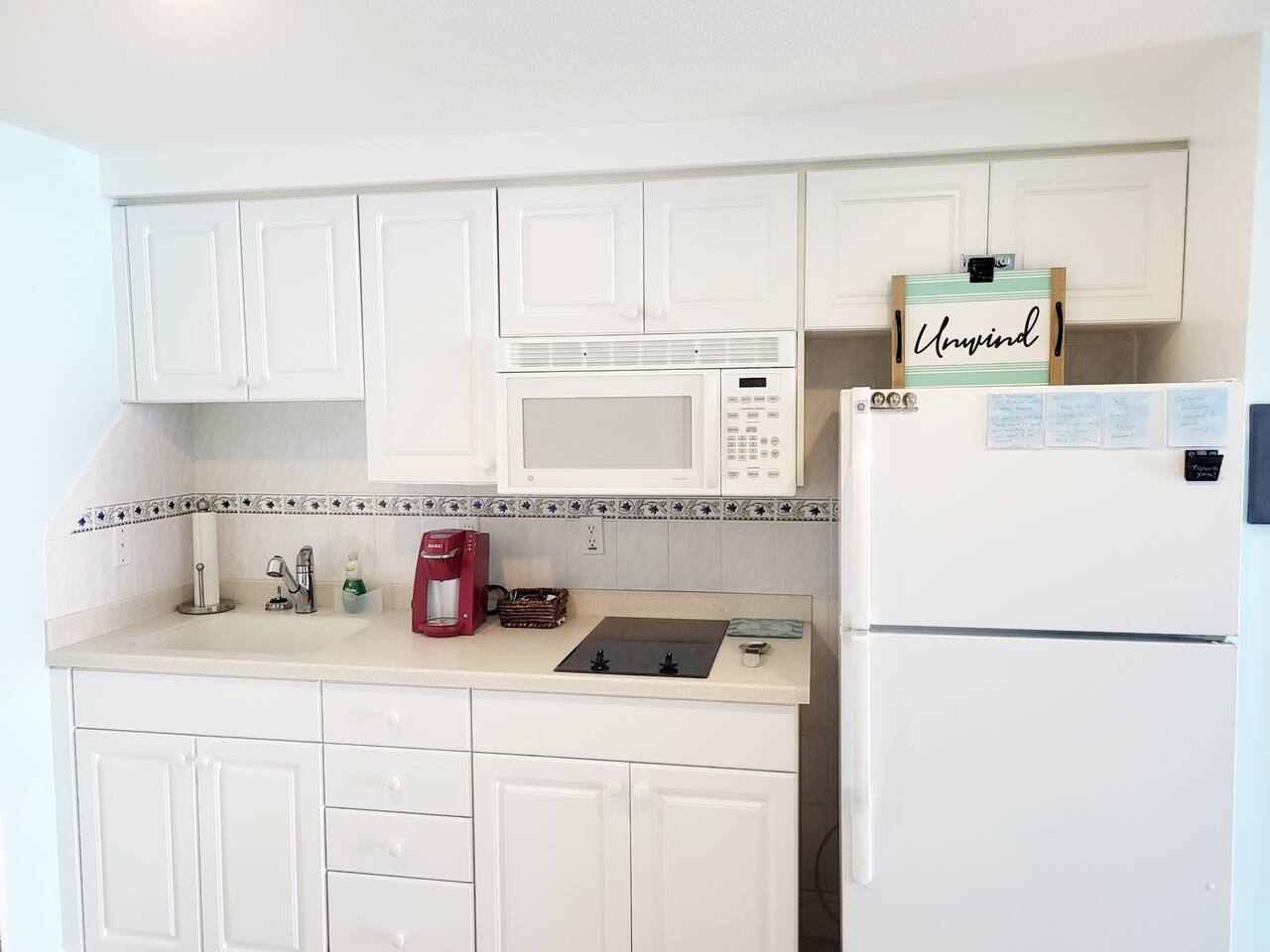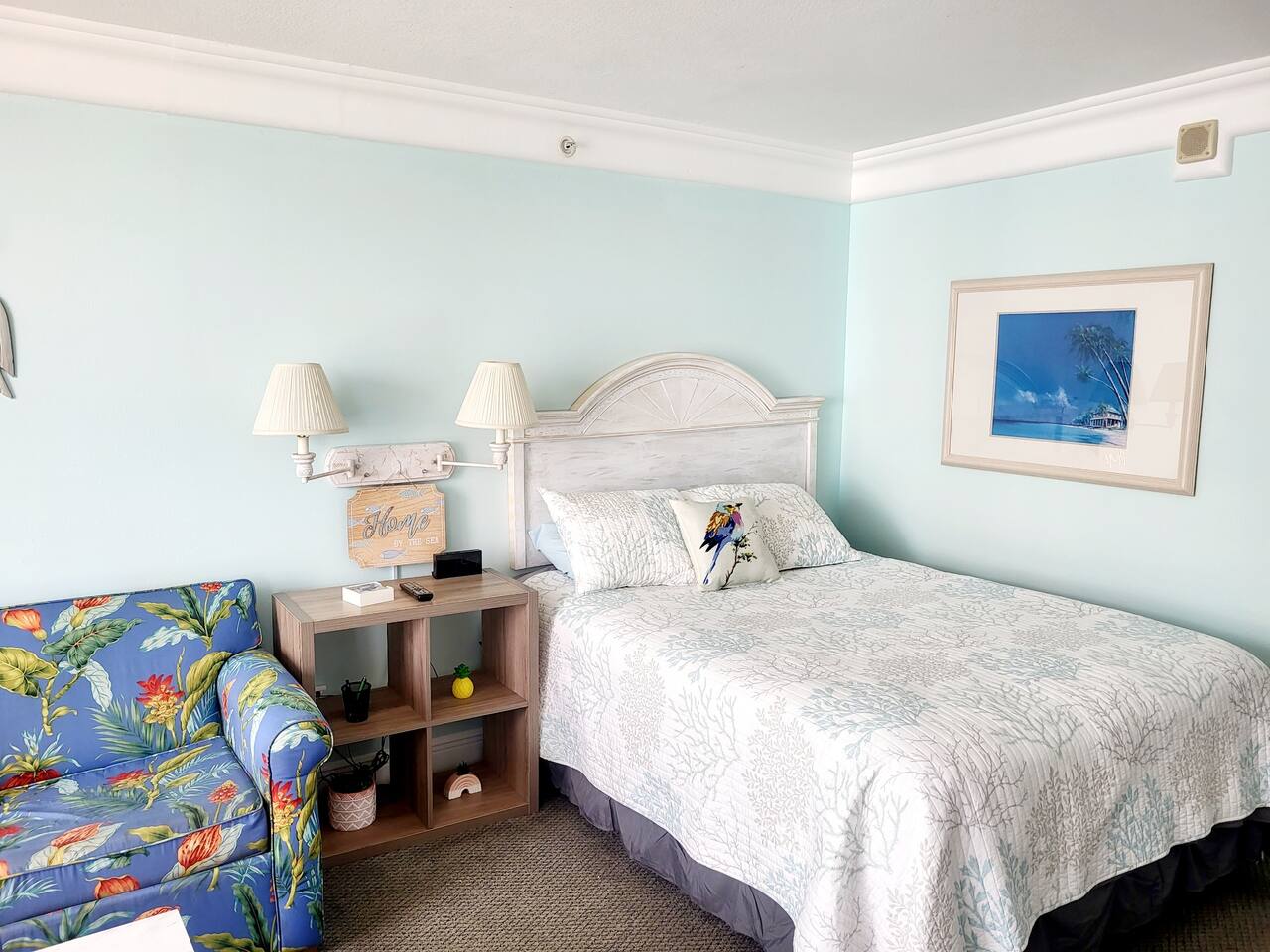 Cozy studio unit with open floor plan, private bathroom, kitchen area with dining table and 2 chairs, 2 queen beds, and a small Juliette balcony with ocean views & beautiful sunsets. Listen to and watch the ocean waves or watch the sunset in the evening sipping your favorite beverage. The resort is located directly across from the Bellair Shopping plaza which boasts such stores as Walgreens, Publix grocery store, Dollar Tree, retail shopping and restaurants including an ice cream parlor!
