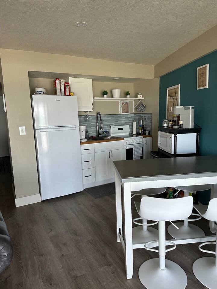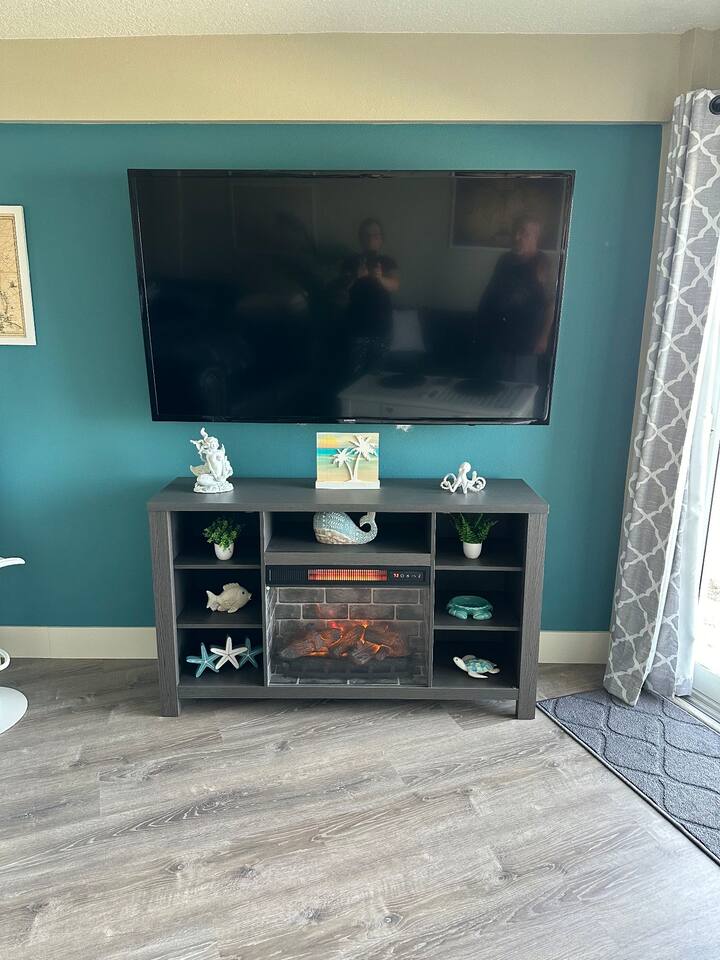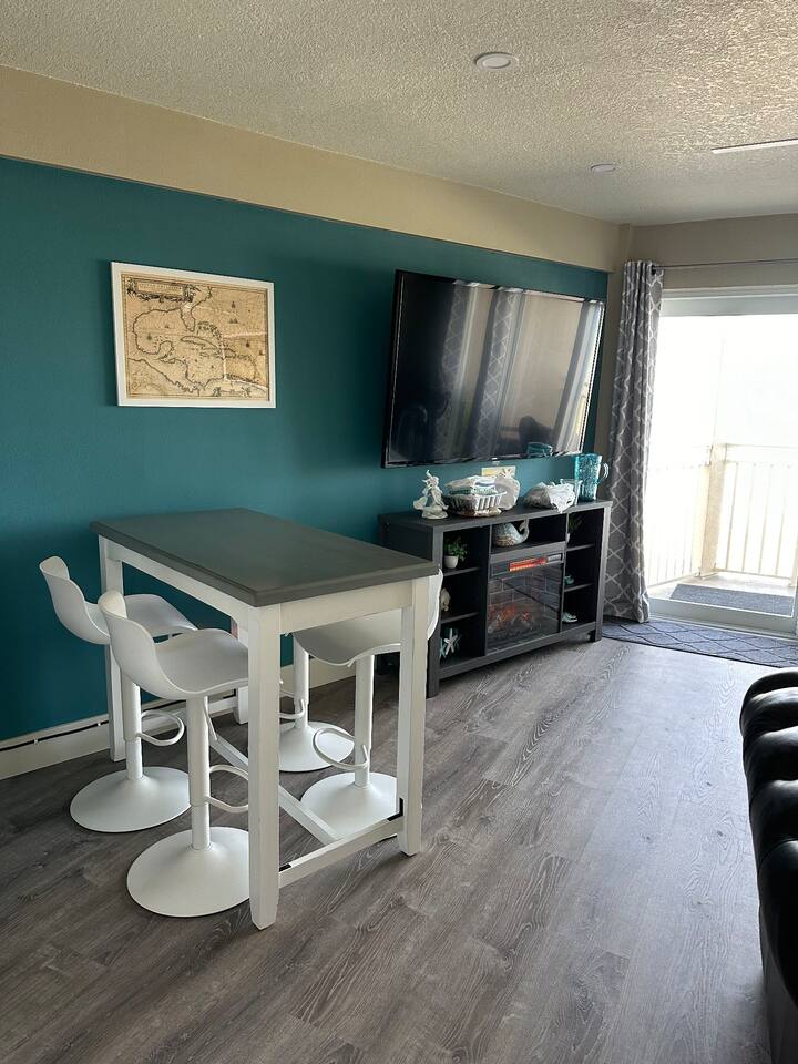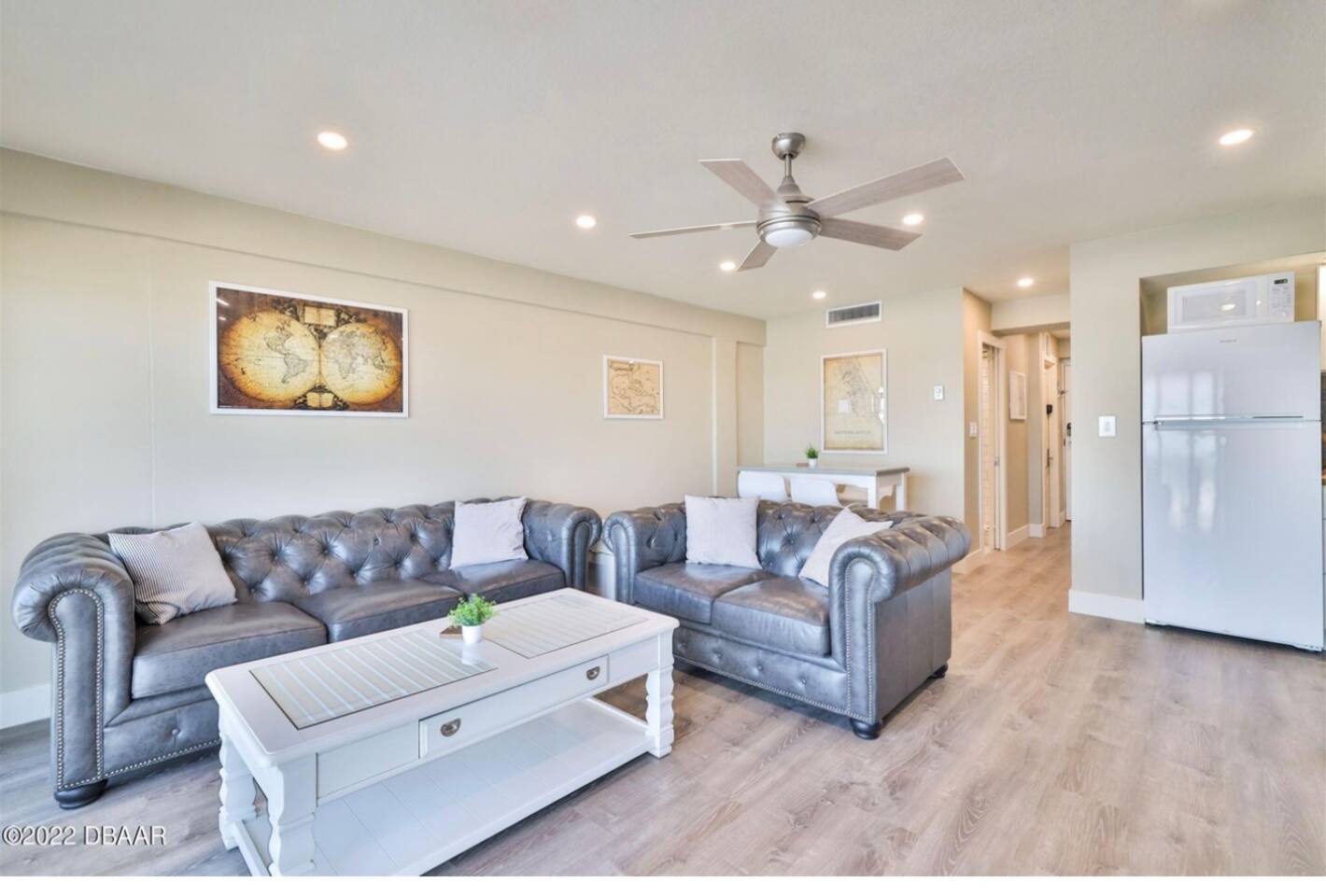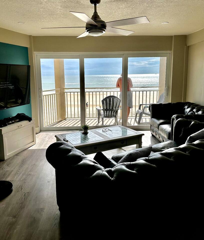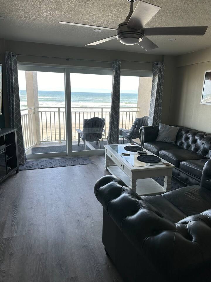 Centrally located 1 bedroom 1 bath beachfront condo w/full kitchen! Walk to the Bandshell, Daytona Lagoon, the Boardwalk, the Daytona Pier & Amusement center. King bed in bedroom w/large smart TV, queen bed in living room along w/couch, loveseat, large smart TV, fireplace cabinet, private balcony. Full kitchen including stove. Private balcony to sit & enjoy beautiful sunrises. Resort has pool, kiddie pool, coin laundry & restaurant in front of the complex. Unit is directly across from elevator.