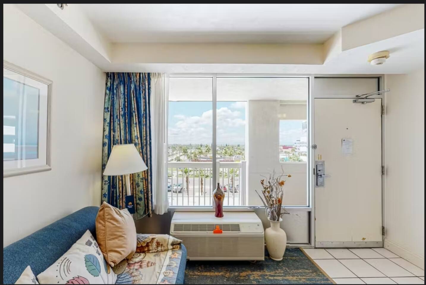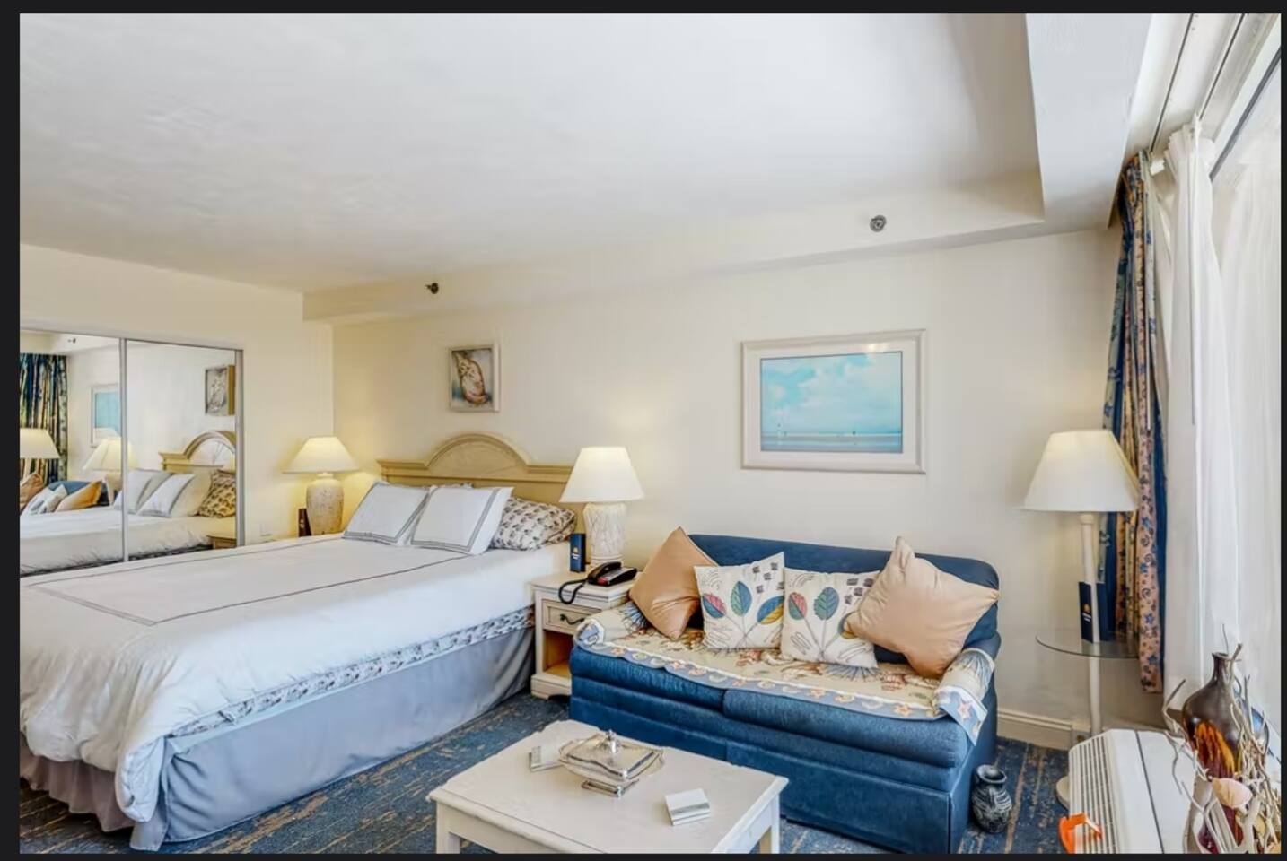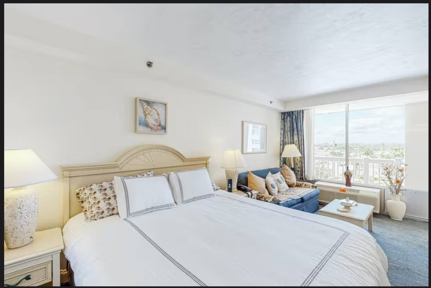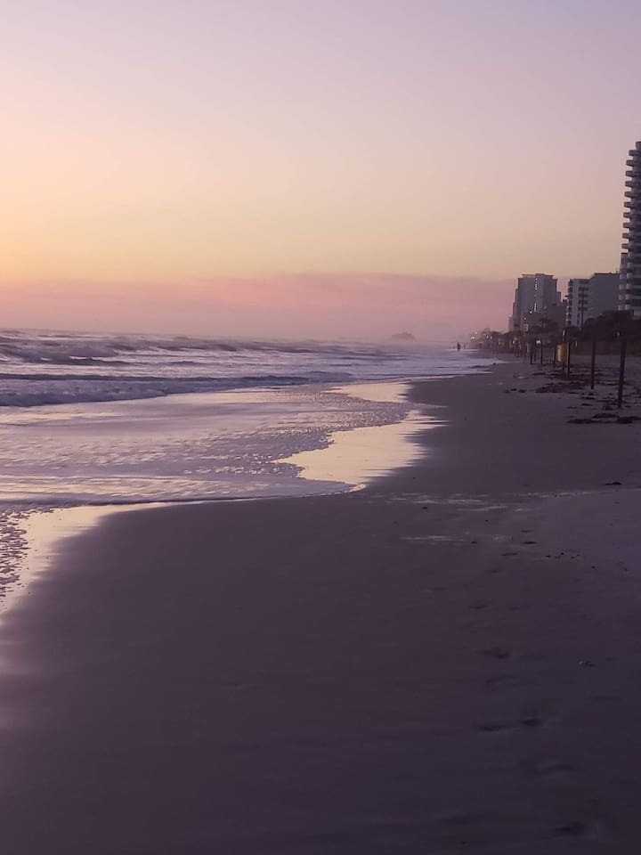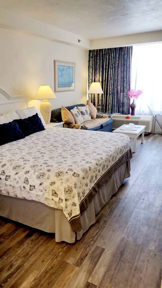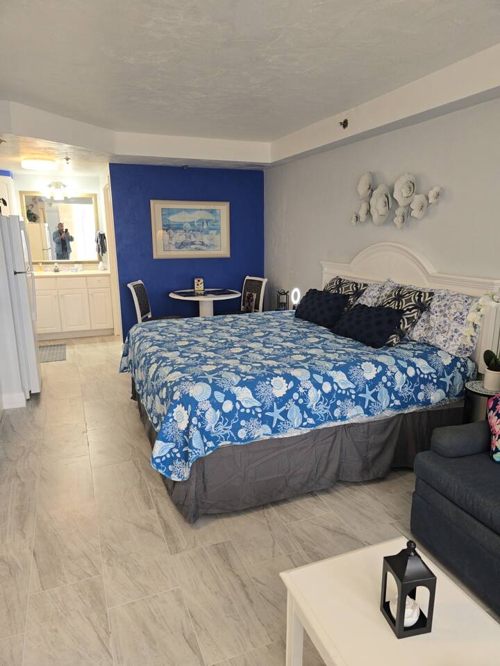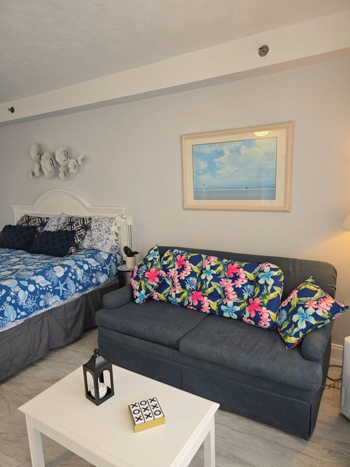 Beautifully decorated King studio unit with beach access, fitness center, sauna, 1 outdoor pool, indoor pool and hot tub. Beautiful sunset views facing street. Unit also has full size sleeper sofa, dining table for 2, full bathroom. We also have coffee maker, 2 burner stove, full size refrigerator, microwave, toaster & all necessary cookware. Conveniently located across from large shopping plaza w/grocery, retail shops & dining and not far from the activities at the Boardwalk
