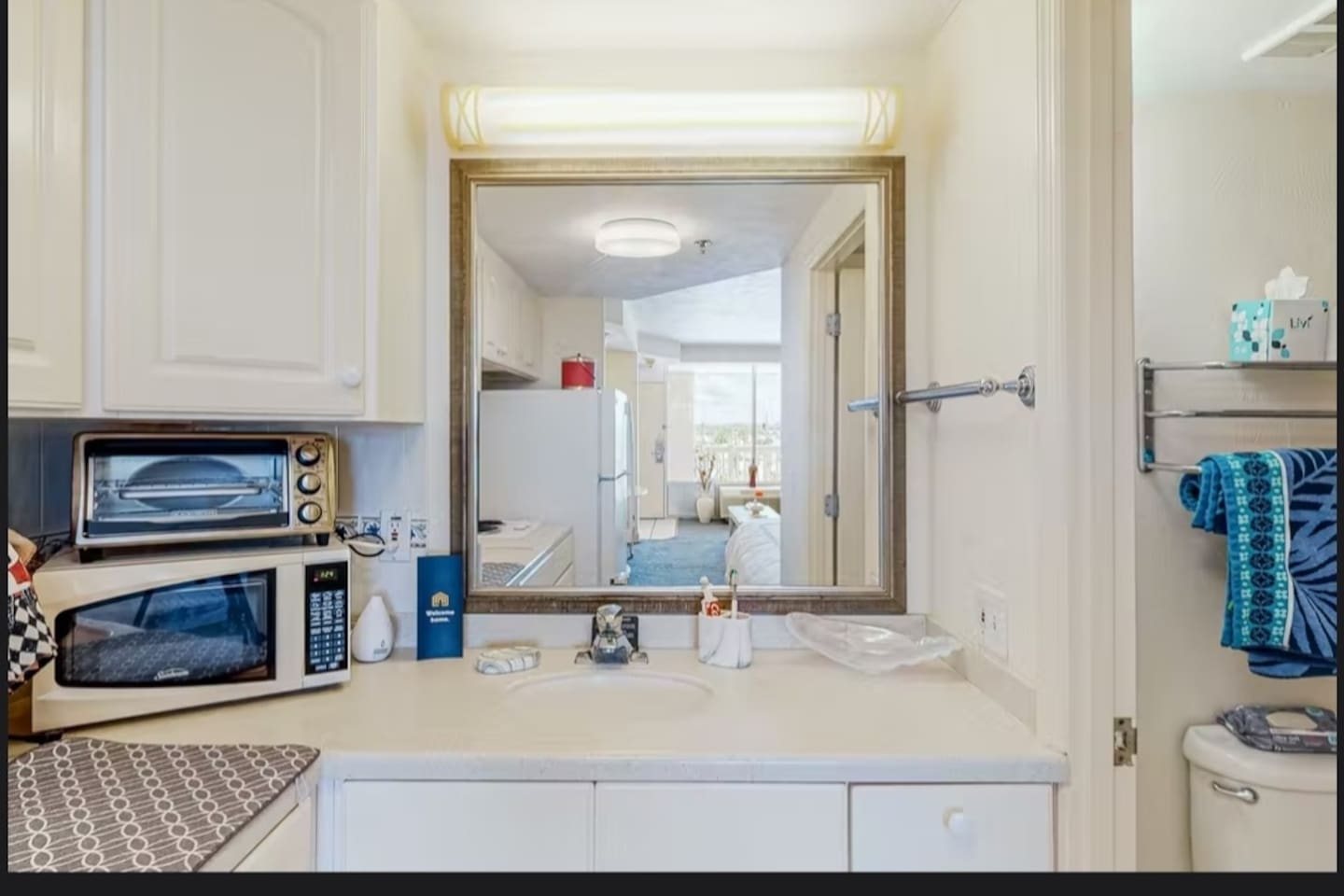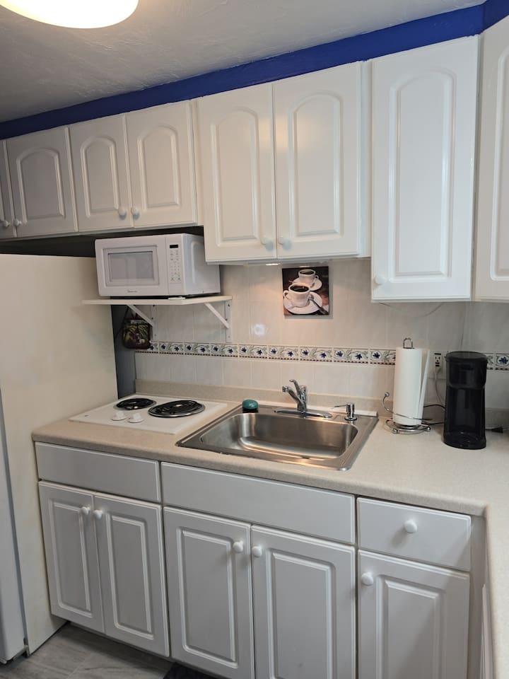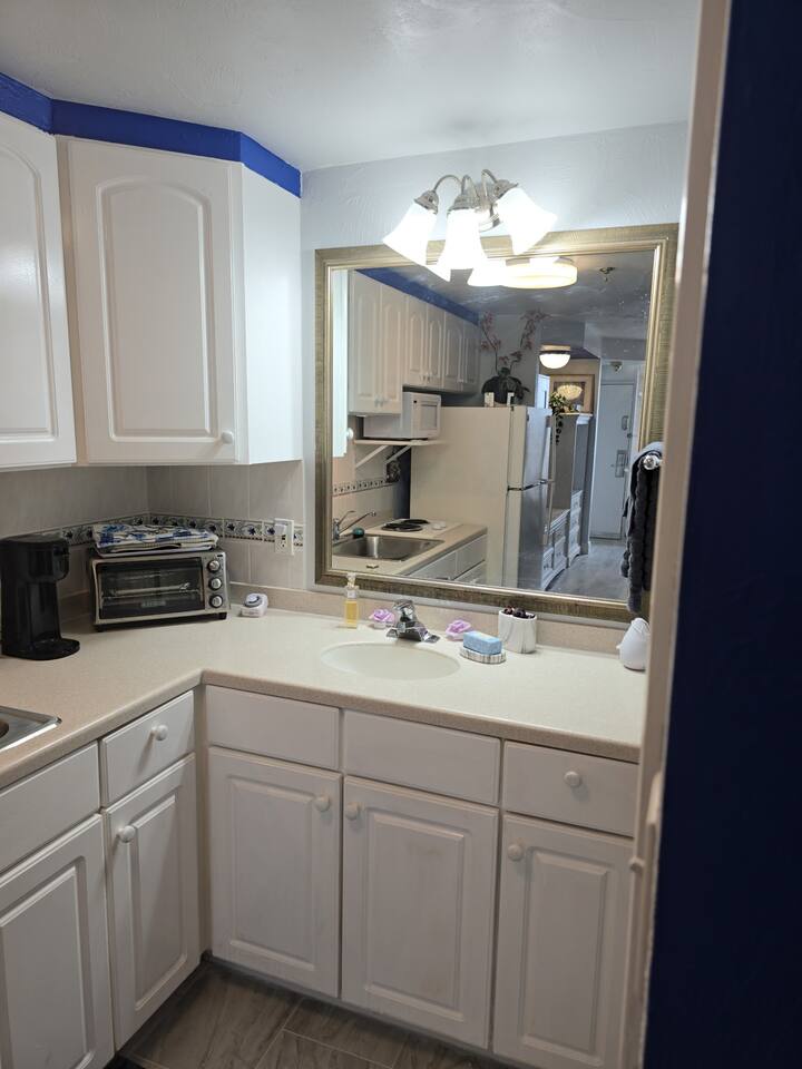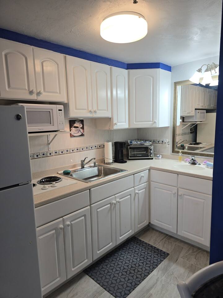 This studio is 309 sq ft with a king bed and full sleeper sofa, full kitchen and bathroom. Kitchen is fully stocked with all necessities to cook a complete meal. Watch your favorite show on the 40" TV with cable. Watch the sunset out the large window.