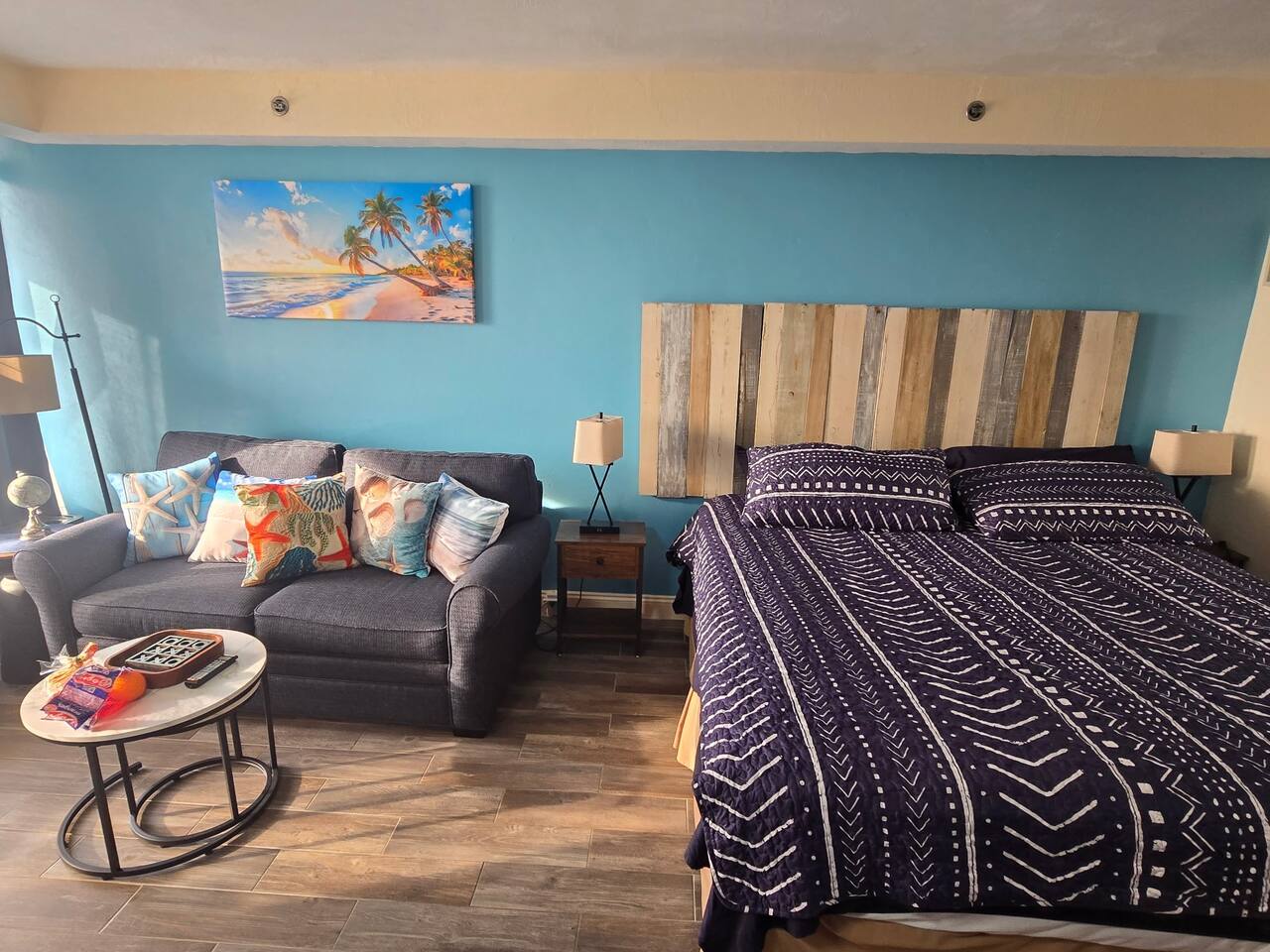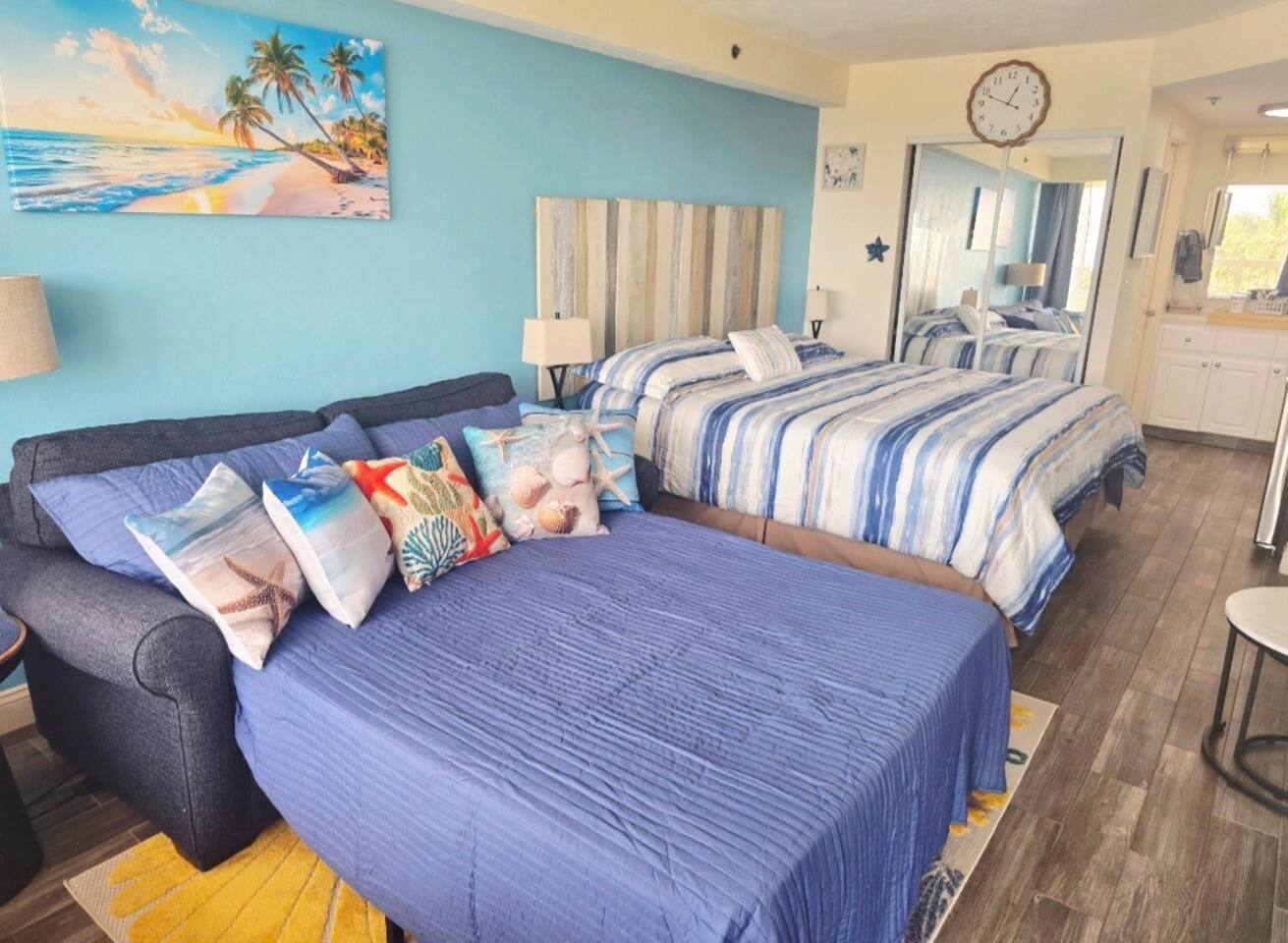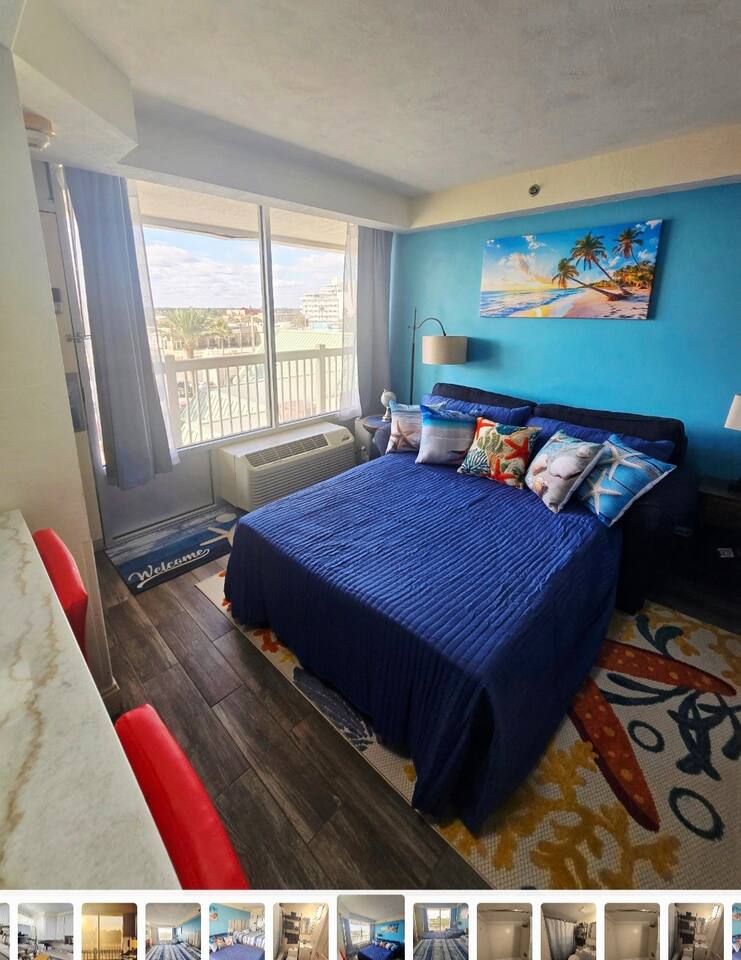 Cozy room with comfy beds, soft towels, full kitchen for those who like to cook but in a resort that offers a restaurant and bar for those who like to relax and let others do the cooking. Room is located on 4th floor and is facing west for beautiful sunsets. There is a balcony that is used as a common walkway but you can put chairs out there and enjoy the sunset. Kitchen includes all cookware, utensils, dishes, electric skillet, coffee maker and coffee (a few pods and creamer will be left to get you started), toaster, toaster oven, 2 burner stove, microwave, full size refrigerator. Beautifully renovated King Studio with new king mattress and new full sleeper sofa, newly tiled floor and updated furniture , infant pack n play upon request, beach towels, all bed linens, bath towels. toiletries, blow dryer, curling iron, a fan for those used to sleeping with the soothing sound, clothes iron. Room sleeps 3 adults or a family of 4 plus an infant as we do have a pack n play available upon request. No more than 3 adults would be advisable as the pull out sleeper is small. The studio is 309 sq ft. This room is privately owned and is not under the assistance of the resort. There is no daily housekeeping. The front desk does not manage this unit. If you have a question please message me. This unit is located in a resort. We are at the mercy of the resort's rules. Please be aware they may close the pool during inclement weather, and the tiki bar may not be open during the slow weekdays.