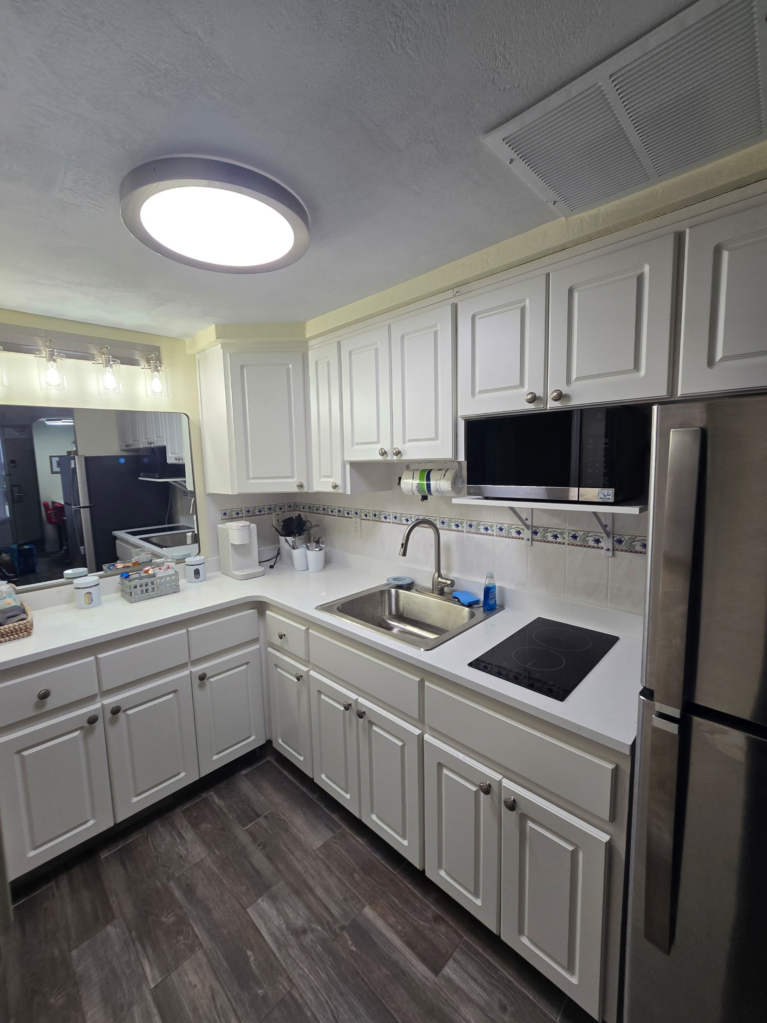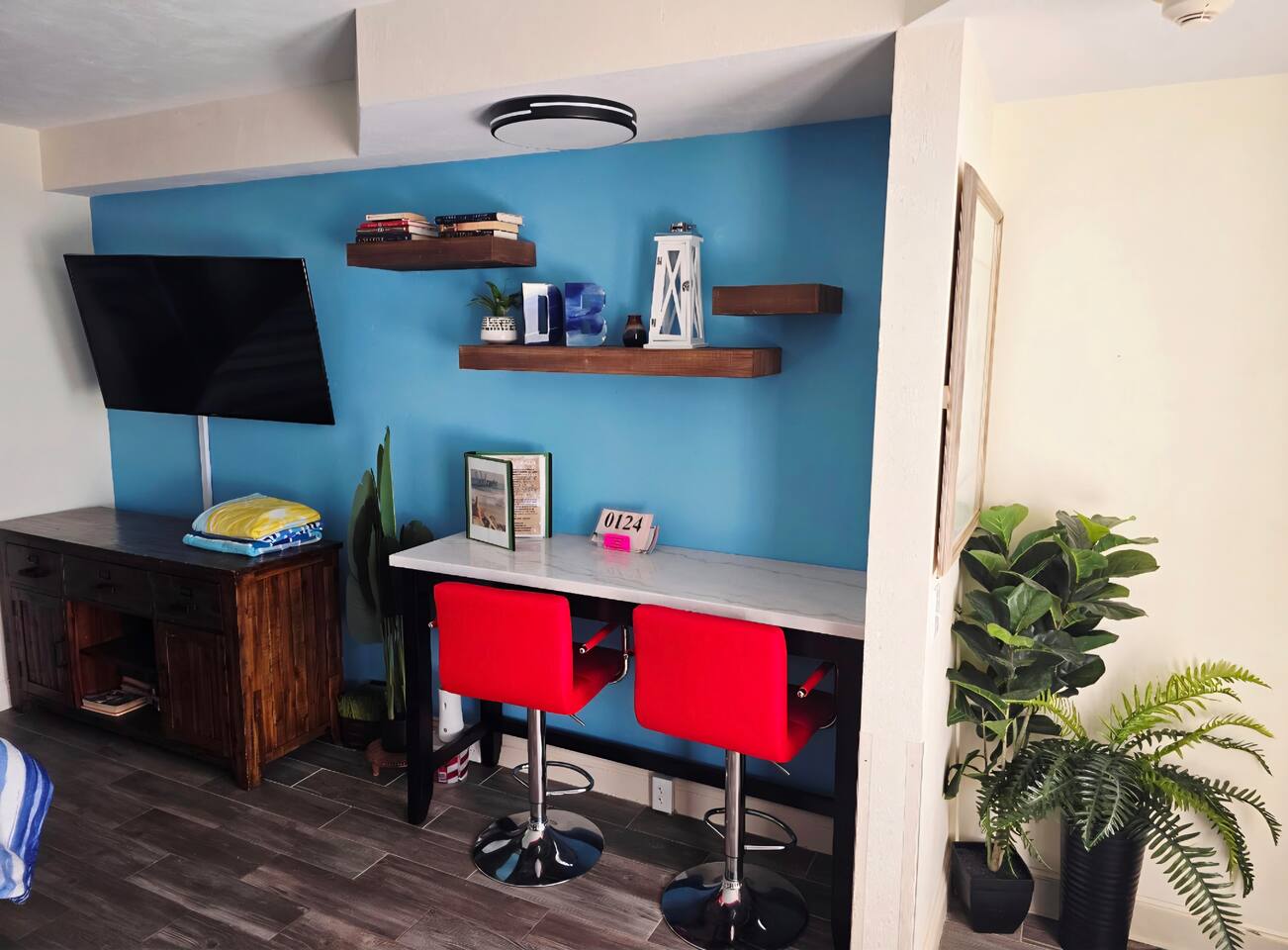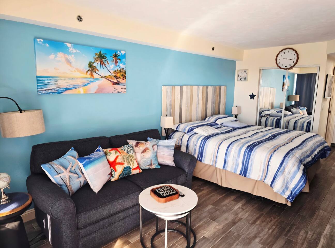 Cozy room with comfy beds, soft towels, full kitchen for those who like to cook but in a resort that offers a restaurant and bar for those who like to relax and let others do the cooking. Room is located on 4th floor and is facing west for beautiful sunsets. There is a balcony that is used as a common walkway but you can put chairs out there and enjoy the sunset. Kitchen includes all cookware, utensils, dishes, electric skillet, coffee maker and coffee (a few pods and creamer will be left to get you started), toaster, toaster oven, 2 burner stove, microwave, full size refrigerator. Beautifully renovated King Studio with new king mattress and new full sleeper sofa, newly tiled floor and updated furniture , infant pack n play upon request, beach towels, all bed linens, bath towels. toiletries, blow dryer, curling iron, a fan for those used to sleeping with the soothing sound, clothes iron. Room sleeps 3 adults or a family of 4 plus an infant as we do have a pack n play available upon request. No more than 3 adults would be advisable as the pull out sleeper is small. The studio is 309 sq ft. This room is privately owned and is not under the assistance of the resort. There is no daily housekeeping. The front desk does not manage this unit. If you have a question please message me. This unit is located in a resort. We are at the mercy of the resort's rules. Please be aware they may close the pool during inclement weather, and the tiki bar may not be open during the slow weekdays.
