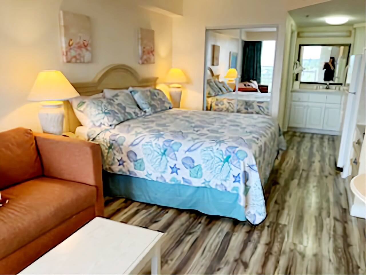 Cozy street facing room with King sized bed and sleeper sofa. Located in a beachside, laid-back resort that is 2.9 miles north of the Daytona Beach Boardwalk and Bandshell and 6 miles from Riviera Country Club golf course, and 8 miles from the Daytona International airport. **Update** OUR POOLS ARE CLOSED! WE DO HAVE BEACH ACCESS AND PLENTY OF SUNSHINE Resort is directly across from a large shopping plaza w/ Dollar Tree, grocery store, beach shops, ice cream parlor, restaurants & retail shops.