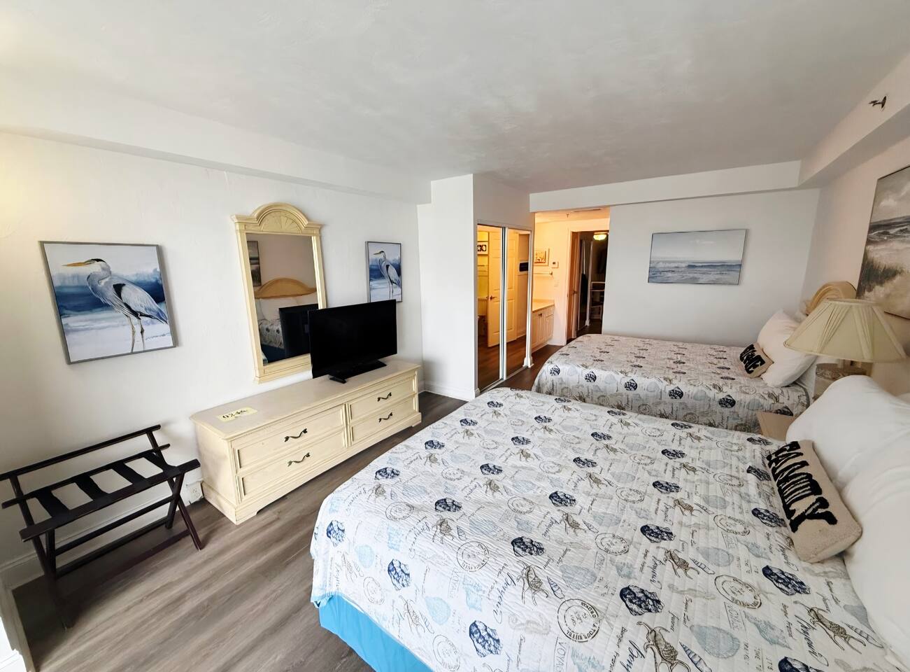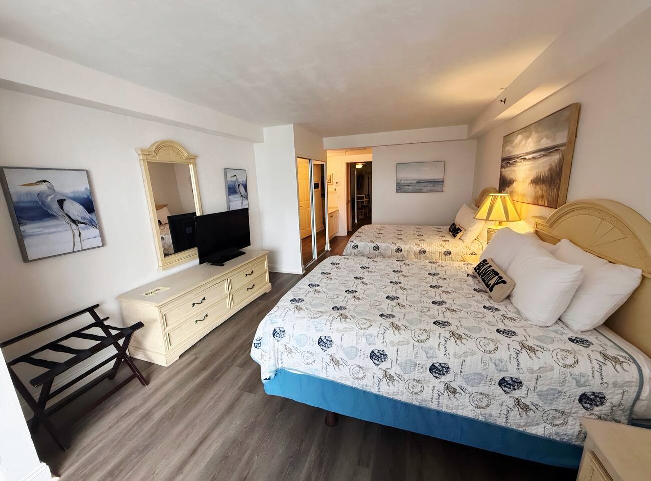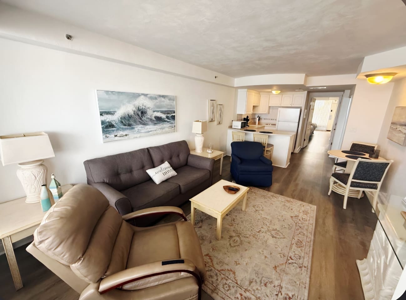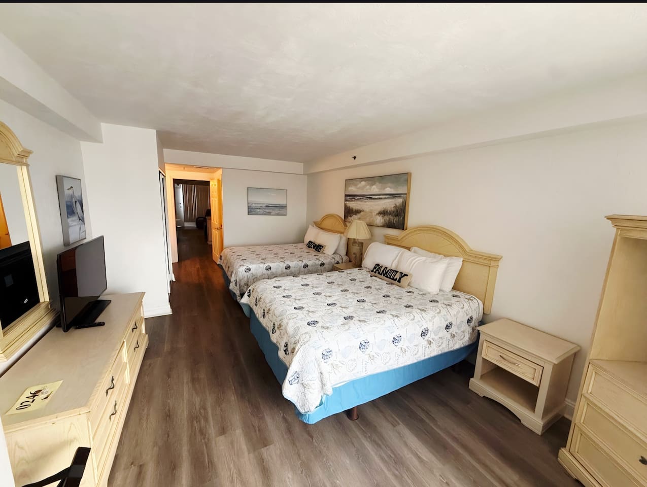 Wake up to the sound of rolling waves & enjoy unobstructed ocean vistas from your private balcony in this large 1-bedroom, direct oceanfront condo. The bedroom features 2 comfortable queen beds w/premium linens, accompanied by a large TV for entertainment. The living area has an open floor plan with kitchen area and bar, includes a queen sleeper sofa, smart TV, and ample seating, providing a relaxed atmosphere for families or groups up to 6 guests. Resort has outdoor & indoor pool, hot tub, gym