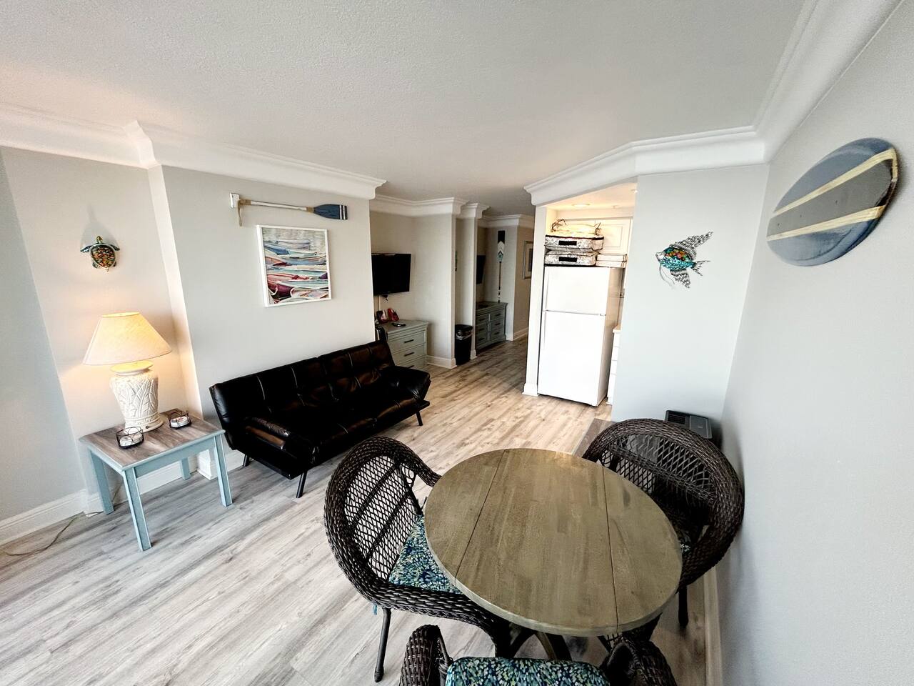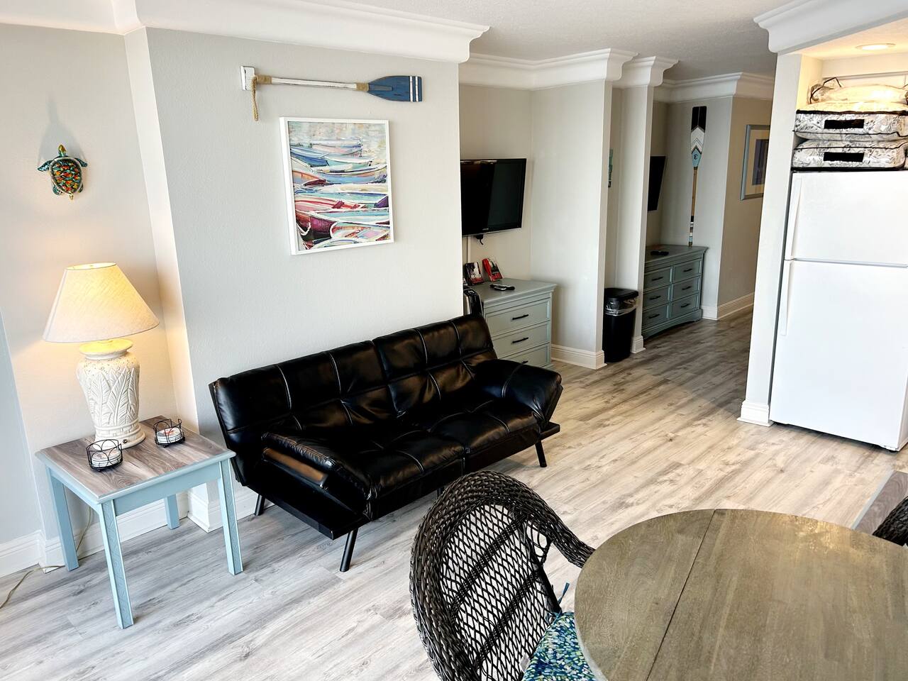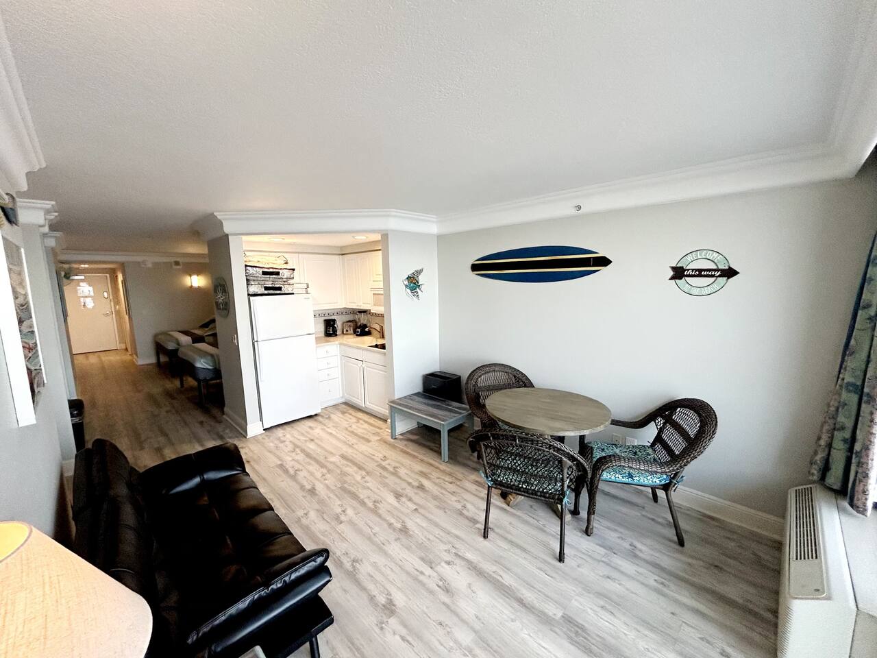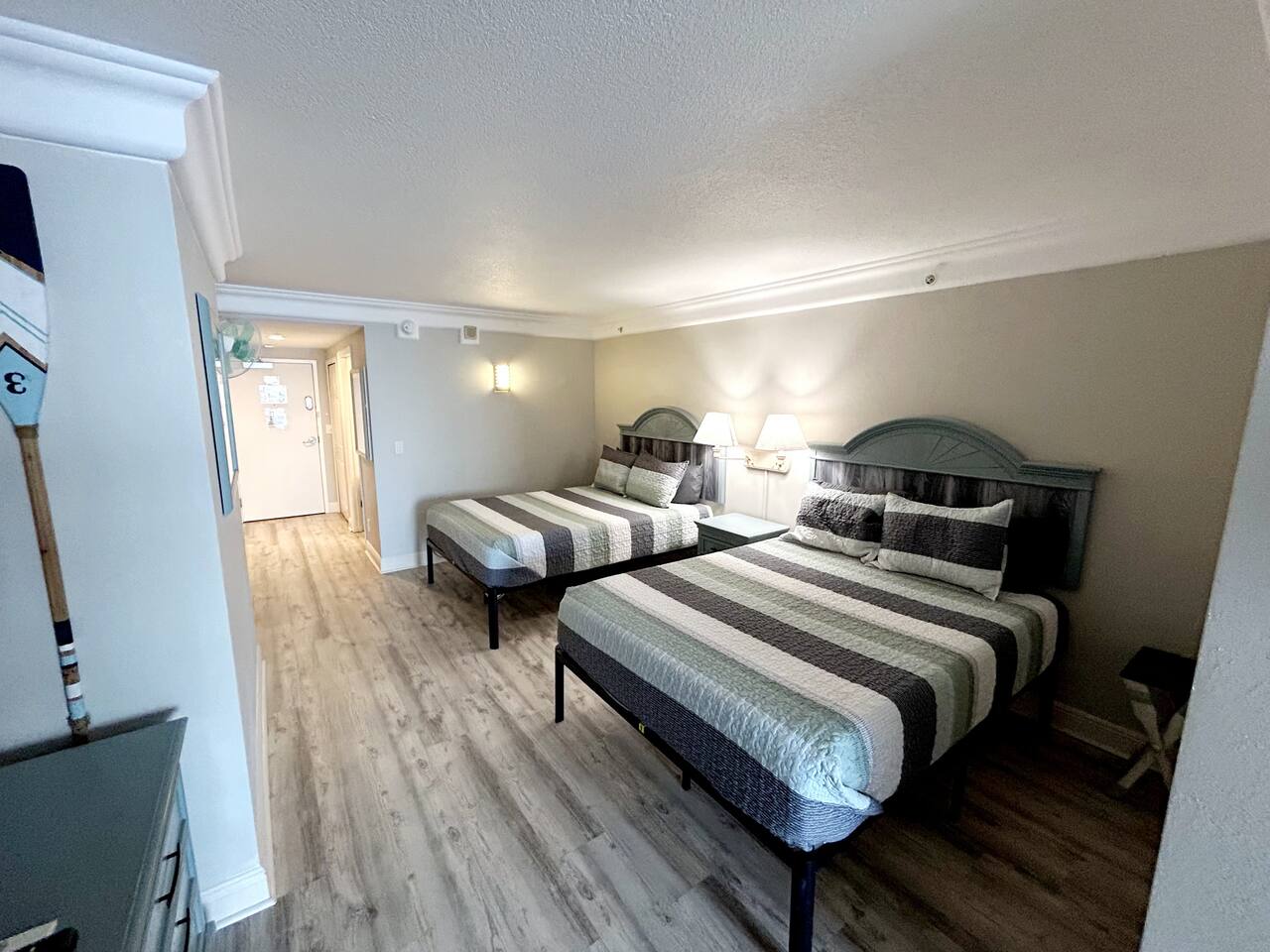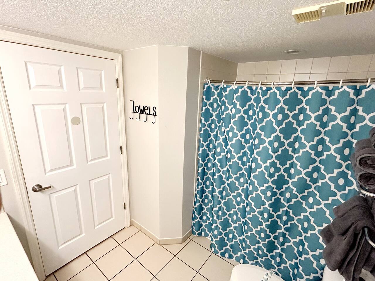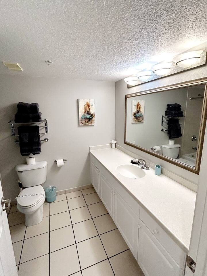 Plenty of room in this updated 1 bedroom. Large bathroom with tub/shower combination, large vanity and lots of storage. Bedroom has 2 very comfy queen beds, all linens supplied, extra blanket and pillows for a futon in living room if you would want to move a child there. Kitchen is fully stocked with all pots, pans, utensils, dishware to cook all of your meals if desired. Our parking garage is closed but we do have parking in the lot next to the resort and overflow parking across the street behind shopping plaza