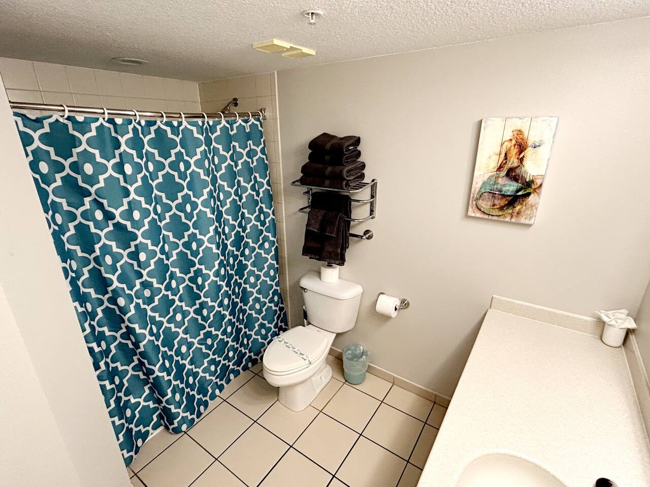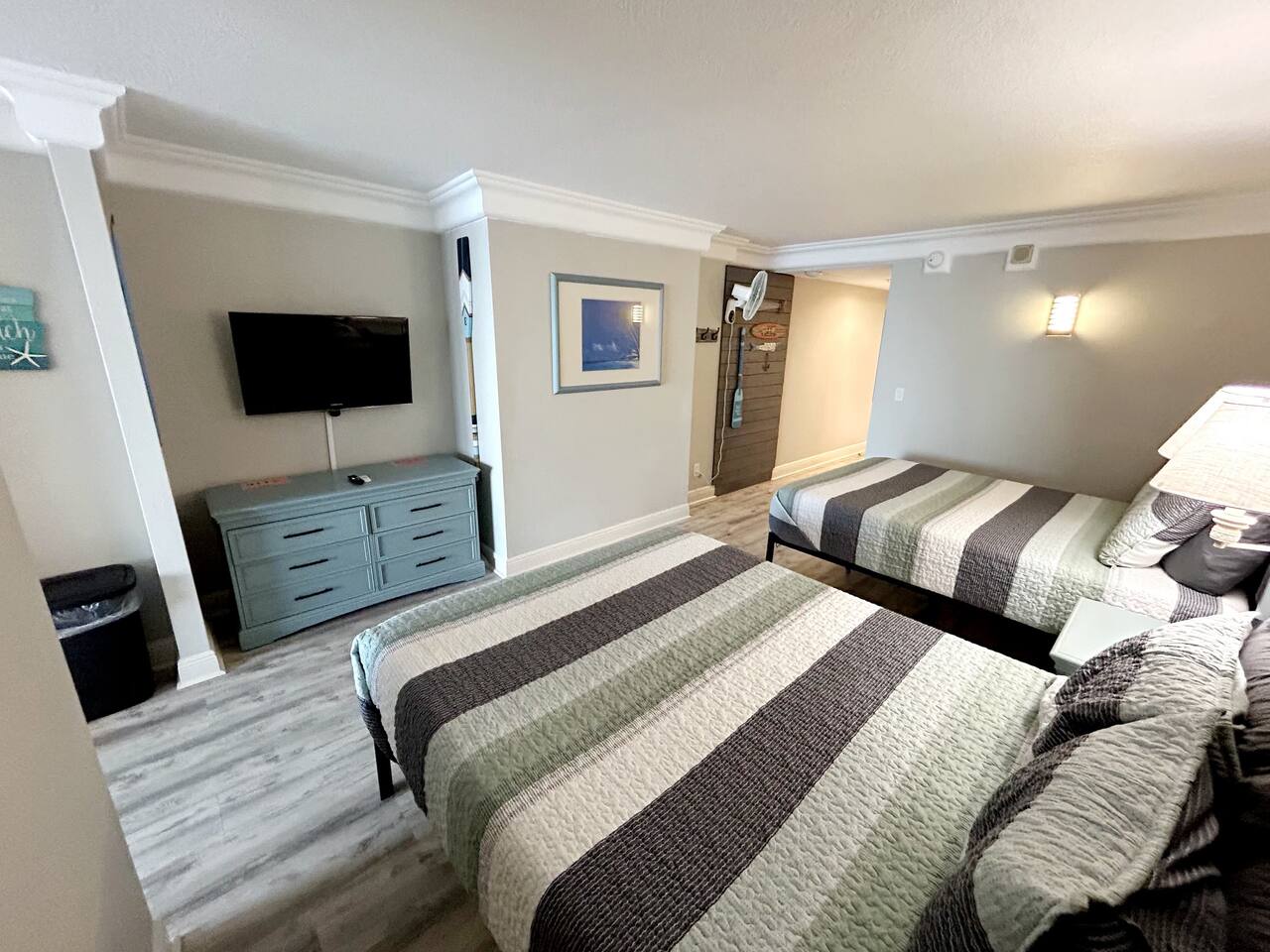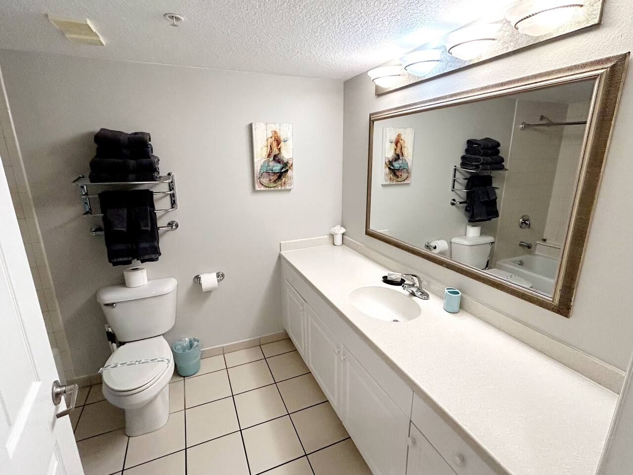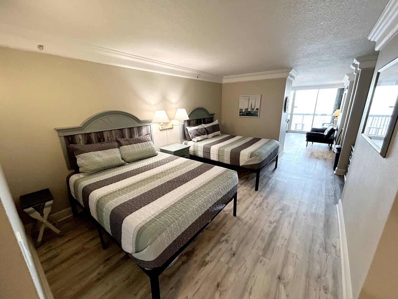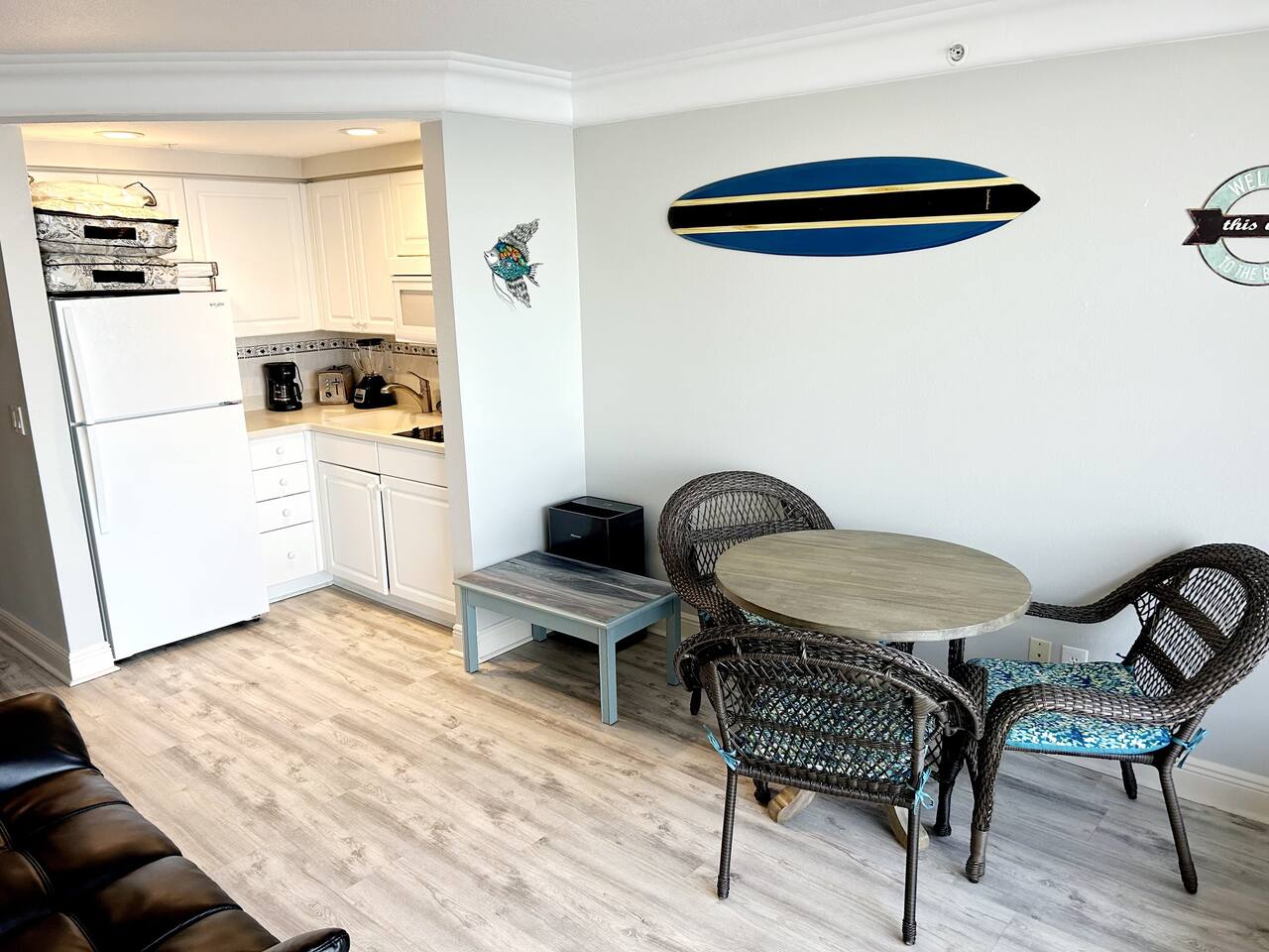Plenty of room in this updated 1 bedroom. Large bathroom with tub/shower combination, large vanity and lots of storage. Bedroom has 2 very comfy queen beds, all linens supplied, extra blanket and pillows for a futon in living room if you would want to move a child there. Kitchen is fully stocked with all pots, pans, utensils, dishware to cook all of your meals if desired. Our parking garage is closed but we do have parking in the lot next to the resort and overflow parking across the street behind shopping plaza