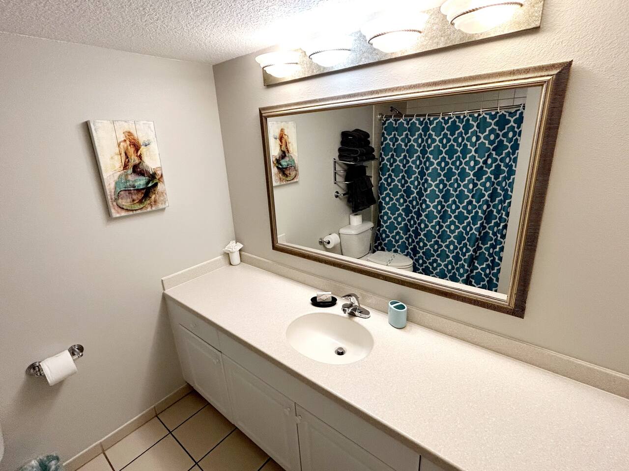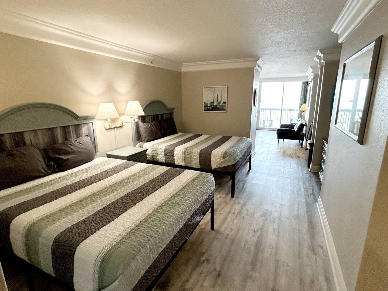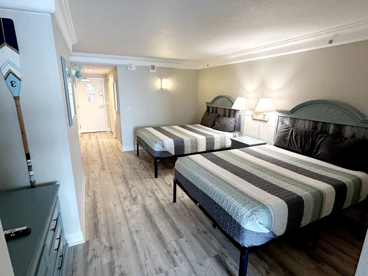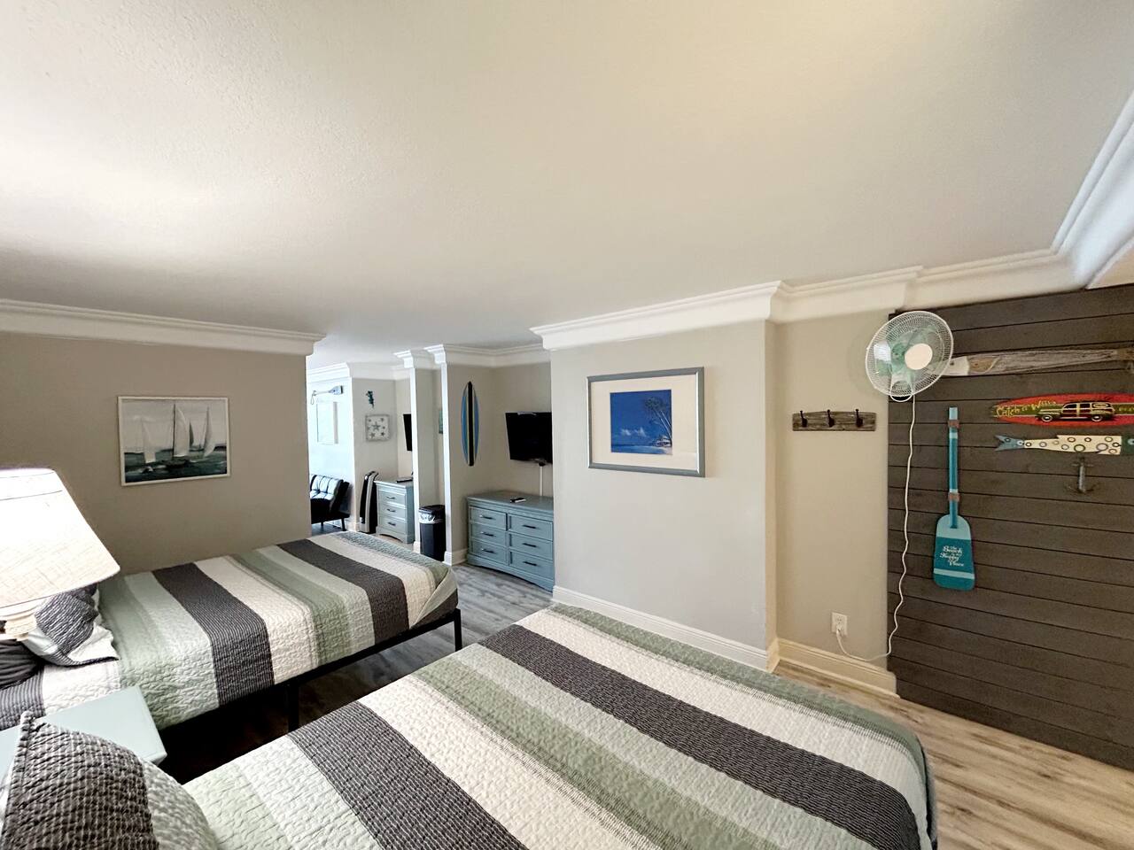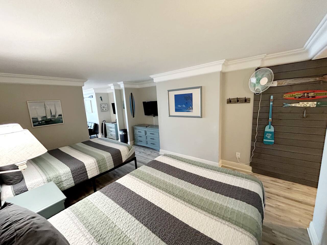Plenty of room in this updated 1 bedroom. Large bathroom with tub/shower combination, large vanity and lots of storage. Bedroom has 2 very comfy queen beds, all linens supplied, extra blanket and pillows for a futon in living room if you would want to move a child there. Kitchen is fully stocked with all pots, pans, utensils, dishware to cook all of your meals if desired. Our parking garage is closed but we do have parking in the lot next to the resort and overflow parking across the street behind shopping plaza