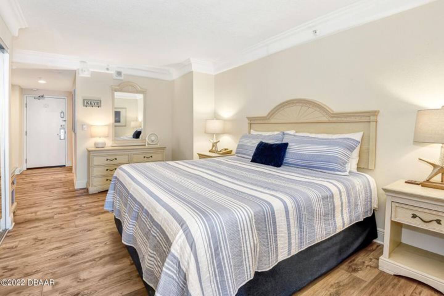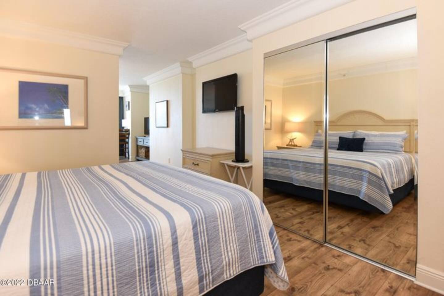 This is a 1 bedroom with an open floor plan so there's no door separating the bedroom. You have to walk through the bedroom from the living room to get to the bathroom. Direct oceanfront private balcony.