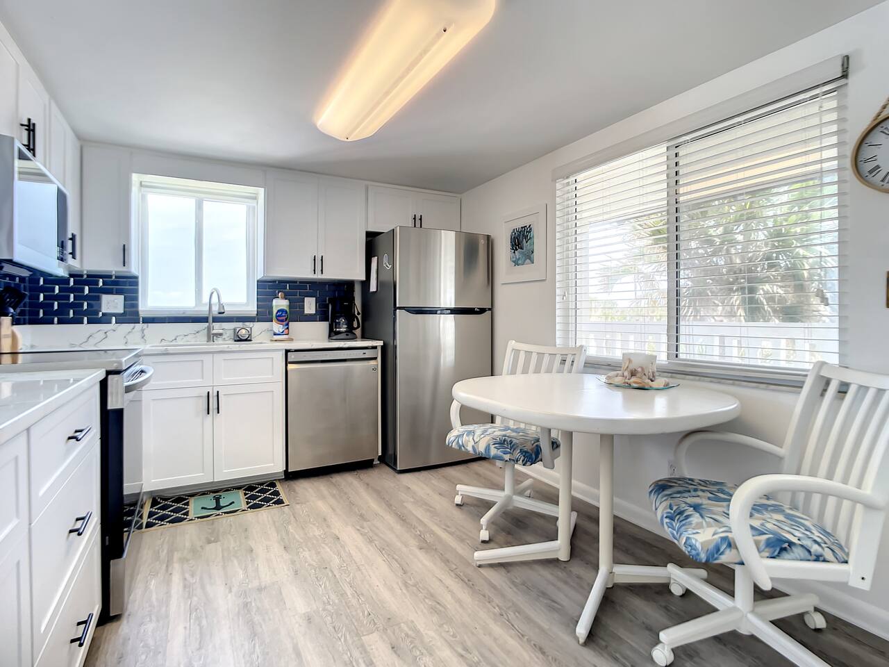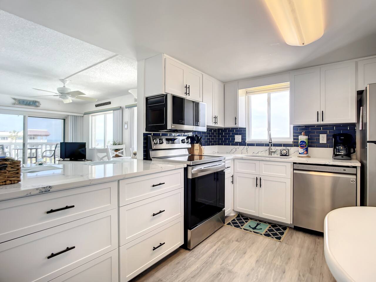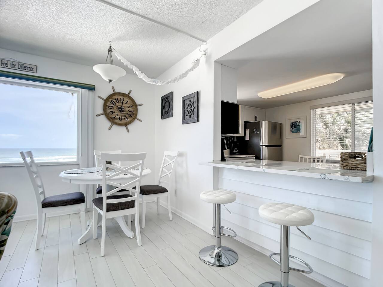 Located in Chateau By The Sea in New Smyrna Beach. This newly updated 1 bedroom 1 bath unit features comfortable furnishings, newly added flooring and a new kitchen. It overlooks the pool and beach from the private balcony. Comfortable King sized bed in master bedroom with large walk-in closet. Unit also has a queen size sleeper sofa with extra mattress padding provided so the unit will sleep four people. The condo is very clean and has its own separate outside entrance. The pool and grounds are well manicured and maintained. Full Kitchen with all stainless steel applicances, stove/oven, dishwasher, microwave, refridgerator and every kitchen utensil you would need to make your own meals. Corner unit closest to the beach. Gorgeous ocean views from the bedroom, living room and kitchen. Outdoor patio overlooks the pool and beach. Feel the ocean breeze and hear the crashing waves from your bedroom window. HDTV in the bedroom and living room with streaming options along with internet access. Beach chairs and beach toys are also provided.