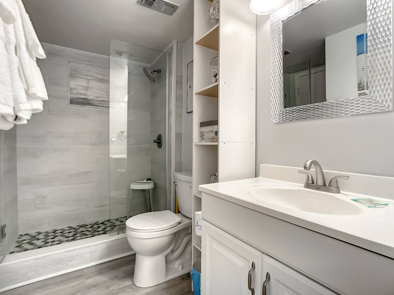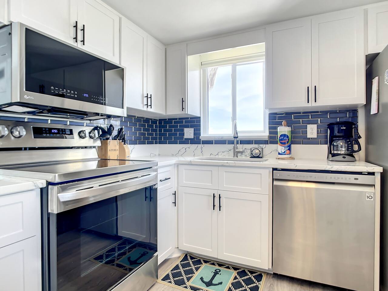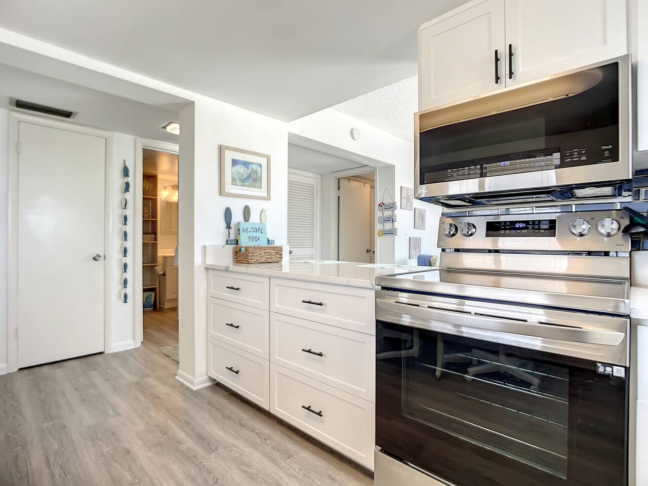 Located in Chateau By The Sea in New Smyrna Beach. This newly updated 1 bedroom 1 bath unit features comfortable furnishings, newly added flooring and a new kitchen. It overlooks the pool and beach from the private balcony. Comfortable King sized bed in master bedroom with large walk-in closet. Unit also has a queen size sleeper sofa with extra mattress padding provided so the unit will sleep four people. The condo is very clean and has its own separate outside entrance. The pool and grounds are well manicured and maintained. Full Kitchen with all stainless steel applicances, stove/oven, dishwasher, microwave, refridgerator and every kitchen utensil you would need to make your own meals. Corner unit closest to the beach. Gorgeous ocean views from the bedroom, living room and kitchen. Outdoor patio overlooks the pool and beach. Feel the ocean breeze and hear the crashing waves from your bedroom window. HDTV in the bedroom and living room with streaming options along with internet access. Beach chairs and beach toys are also provided.