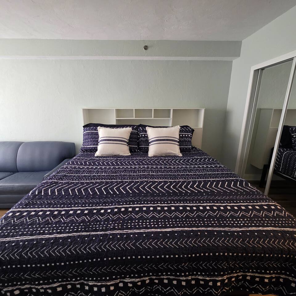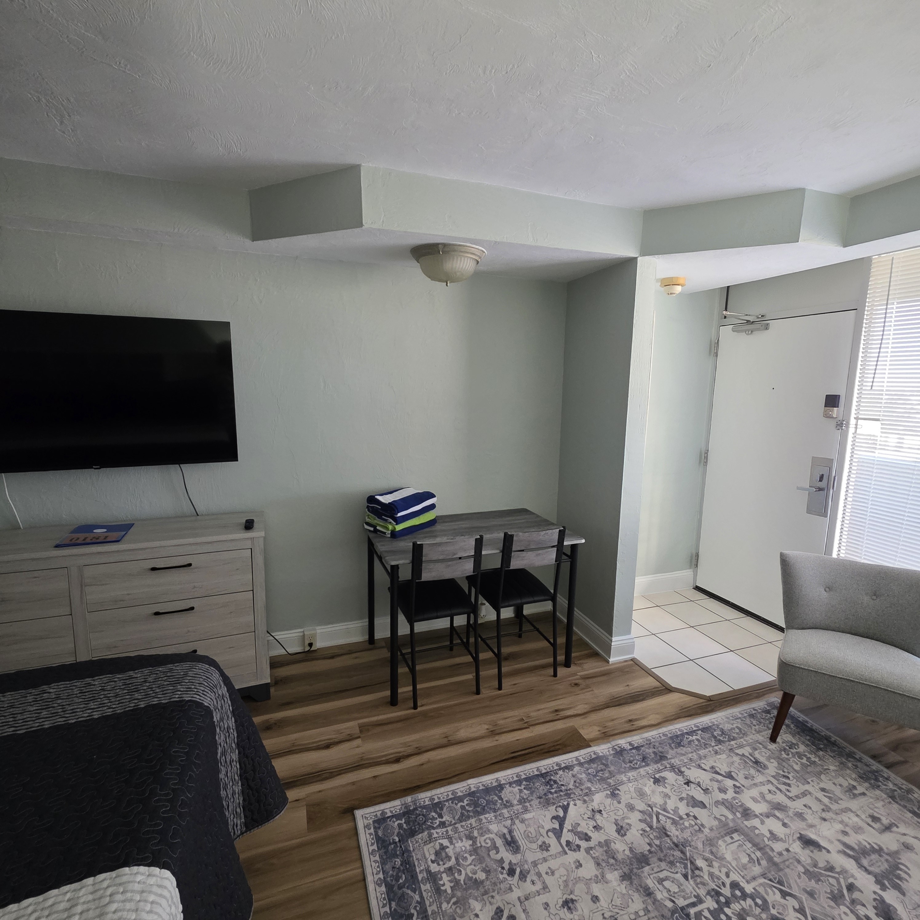 Enjoy our relaxing coastal getaway located just steps from the beach, this bright and airy space features a plush king-size bed, a cozy sitting area, kitchenette, & 55" smart tv. Kitchenette includes a mini-fridge, microwave, stovetop, coffee maker, all diahware—ideal for prepping light meals & snacks. Keep it simple at this peaceful and centrally-located place. Directly across from a large shopping plaza with grocery, dining options retails shops and more. 8 miles from Daytona's Int'l Speedway