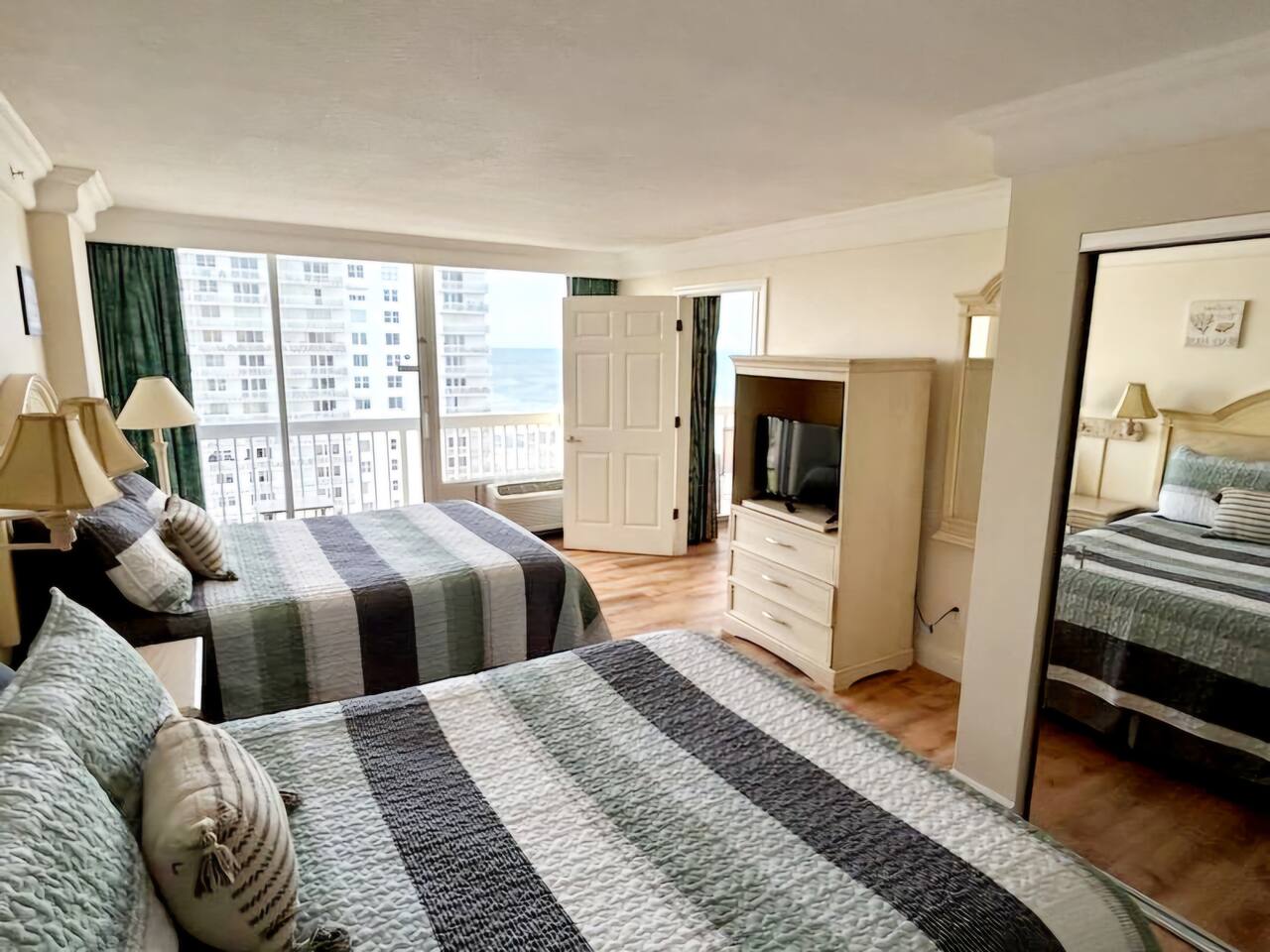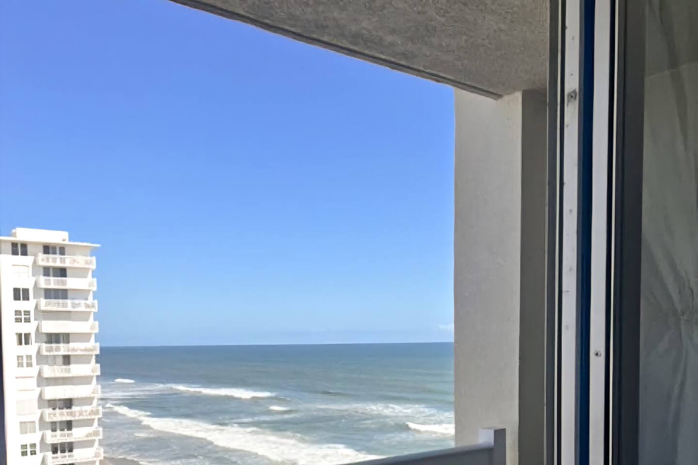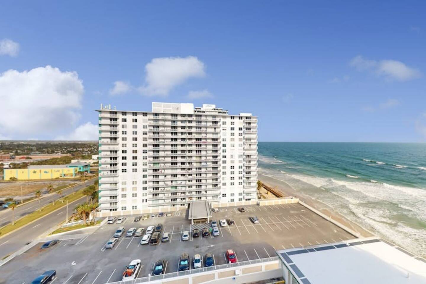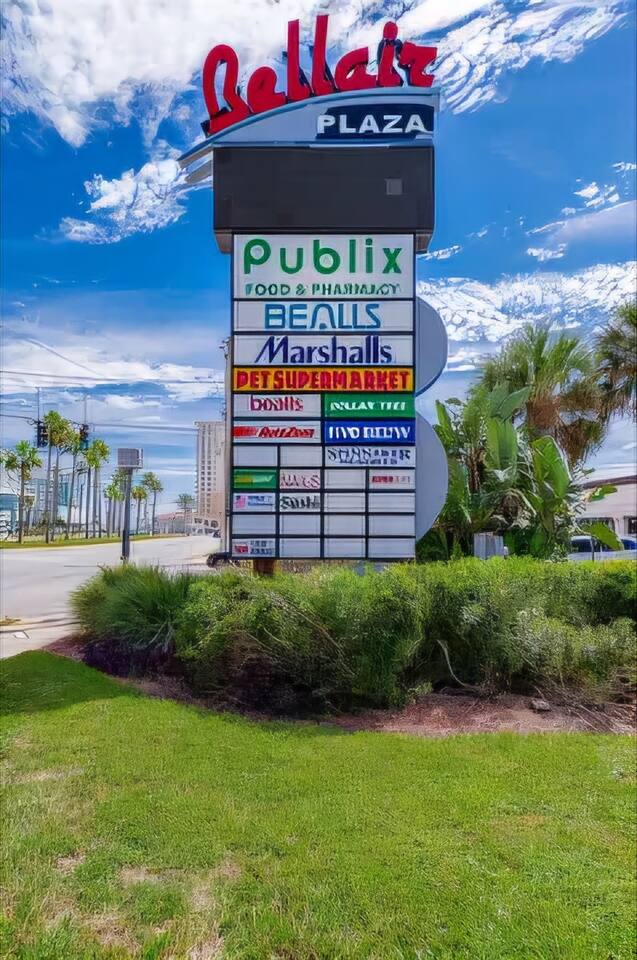 Bring the whole family to this great place with lots of room for fun. Oceanview 1 bedroom 1 bath condo w/full kitchen. 2 balconies to look at the blue waters of the Atlantic. 2 queen beds in the private bedroom, smart TV, and private entrance to bathroom. Large bathroom with shower, and double bowl vanity. Full sized kitchen including all cookware to enjoy meals in. Located across from Bellair Shopping plaza which boasts a grocery store, Walgreens, dining options, and plenty of retail shopping.