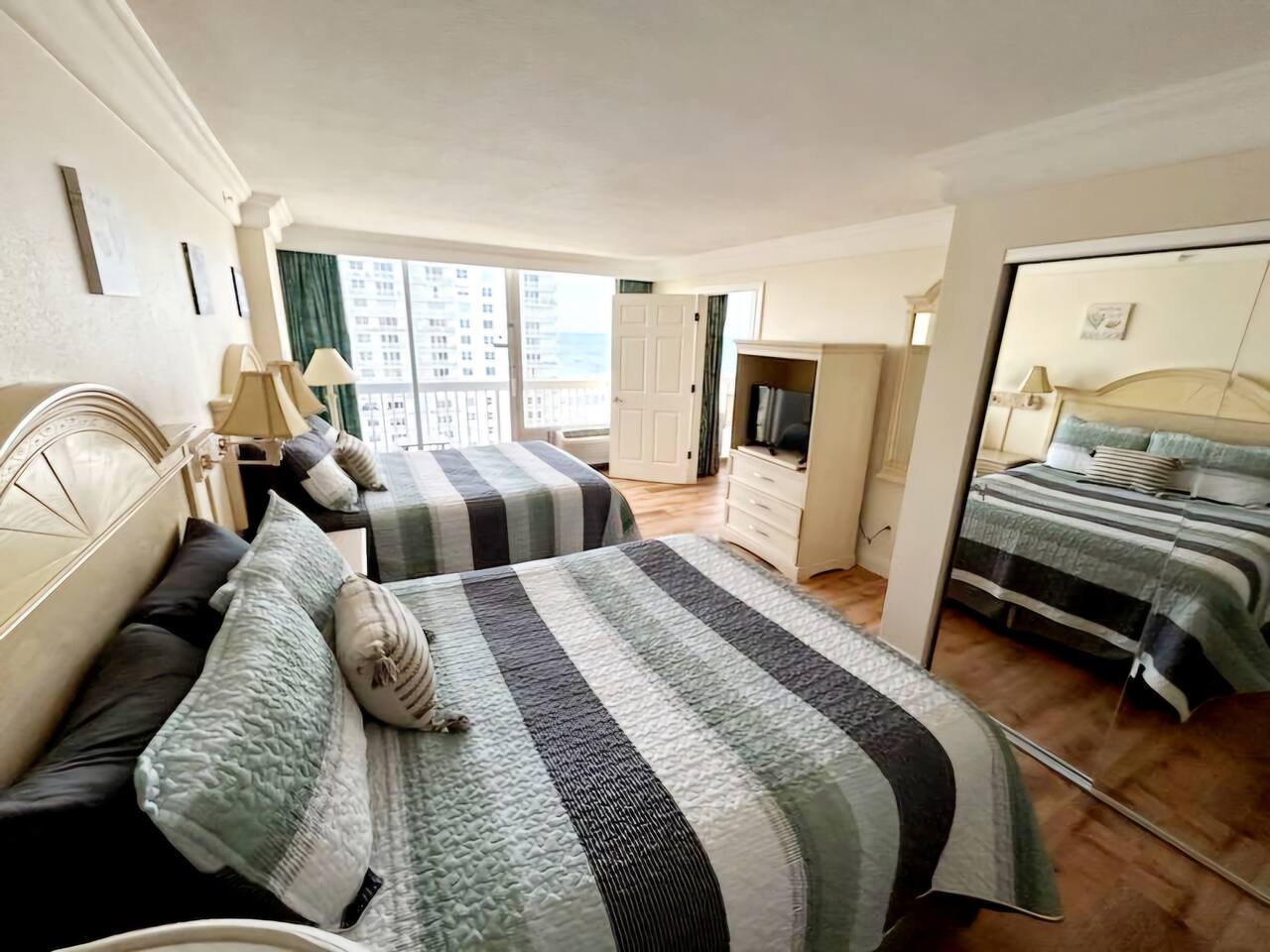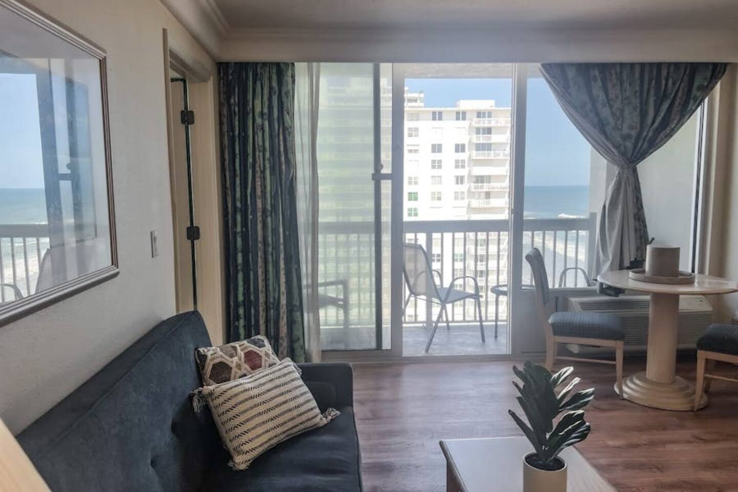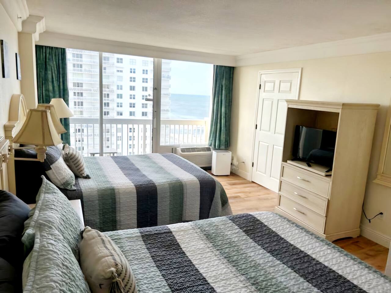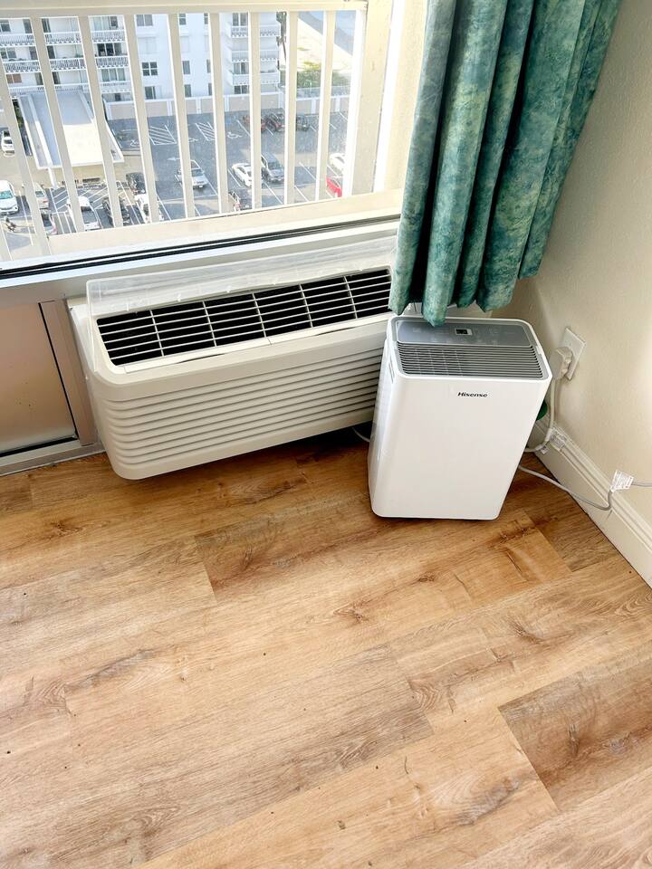 Bring the whole family to this great place with lots of room for fun. Oceanview 1 bedroom 1 bath condo w/full kitchen. 2 balconies to look at the blue waters of the Atlantic. 2 queen beds in the private bedroom, smart TV, and private entrance to bathroom. Large bathroom with shower, and double bowl vanity. Full sized kitchen including all cookware to enjoy meals in. Located across from Bellair Shopping plaza which boasts a grocery store, Walgreens, dining options, and plenty of retail shopping.