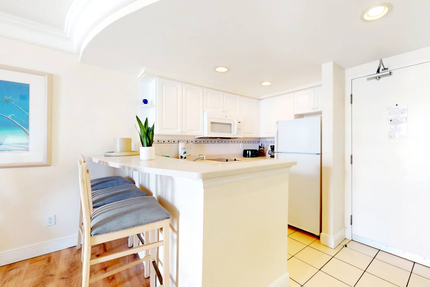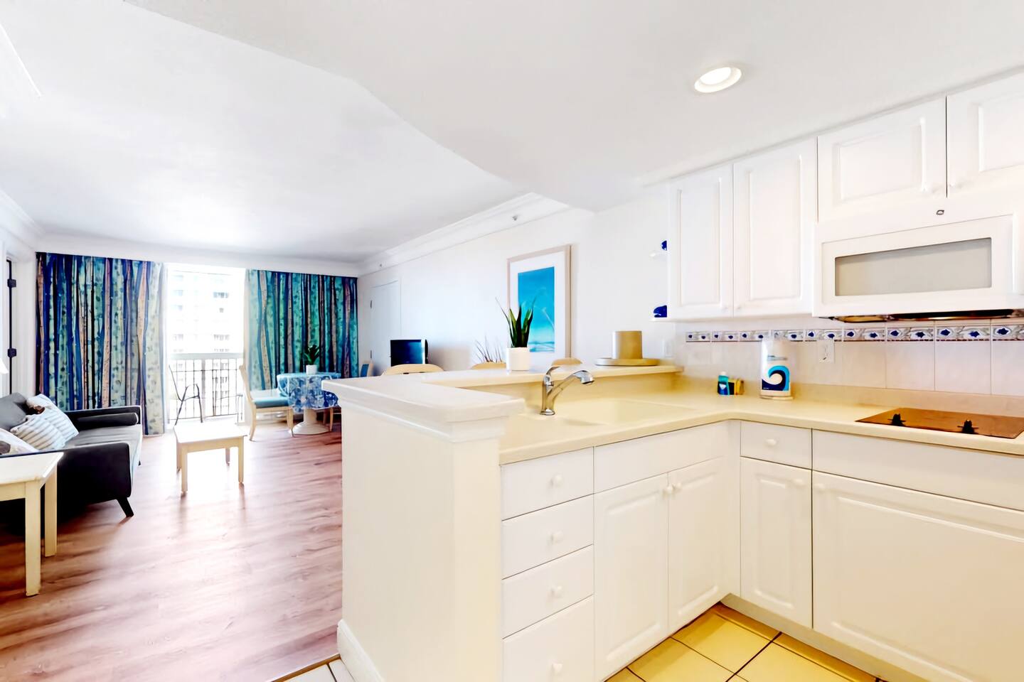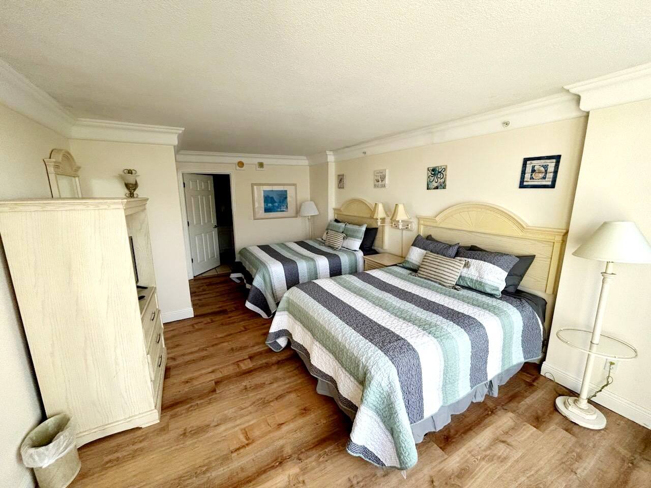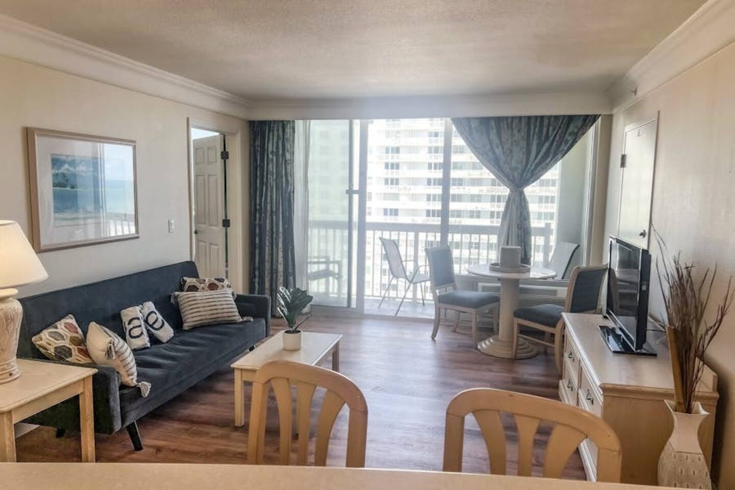 Bring the whole family to this great place with lots of room for fun. Oceanview 1 bedroom 1 bath condo w/full kitchen. 2 balconies to look at the blue waters of the Atlantic. 2 queen beds in the private bedroom, smart TV, and private entrance to bathroom. Large bathroom with shower, and double bowl vanity. Full sized kitchen including all cookware to enjoy meals in. Located across from Bellair Shopping plaza which boasts a grocery store, Walgreens, dining options, and plenty of retail shopping.