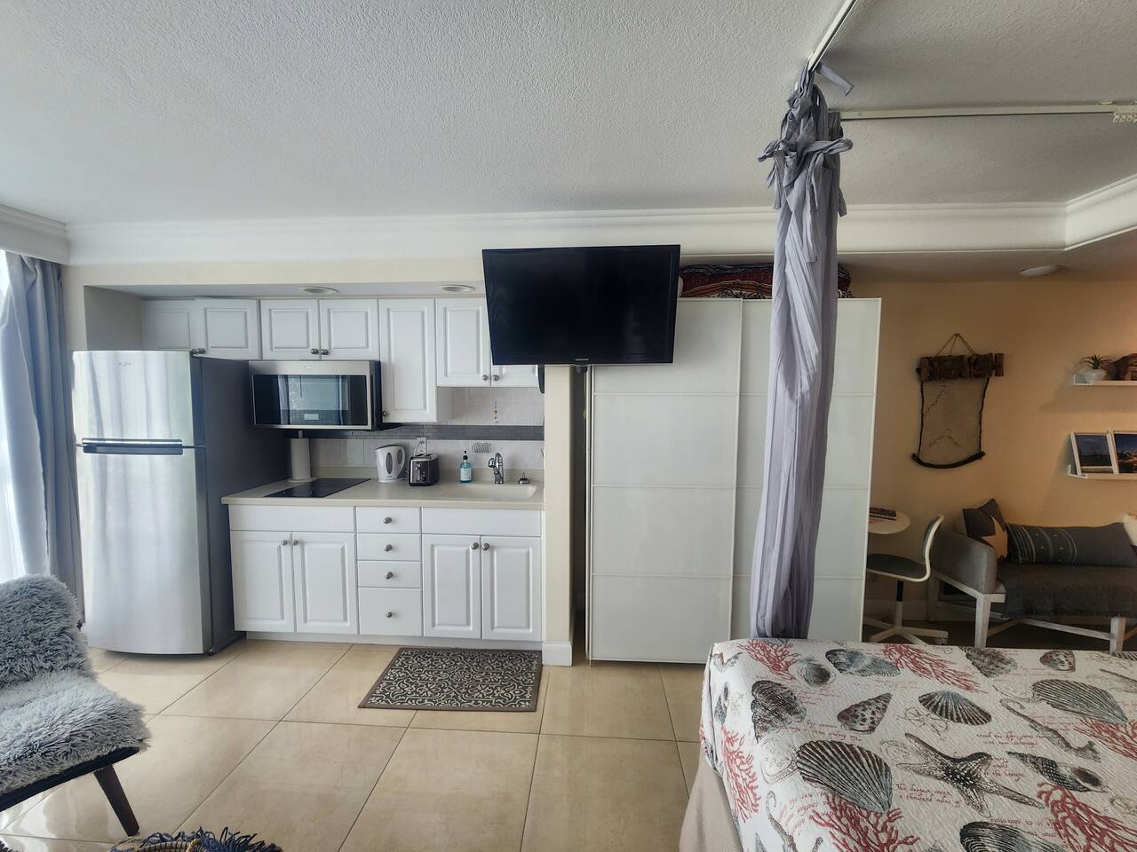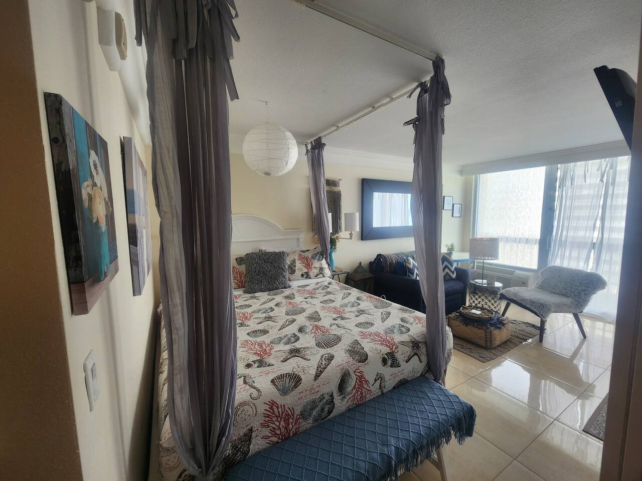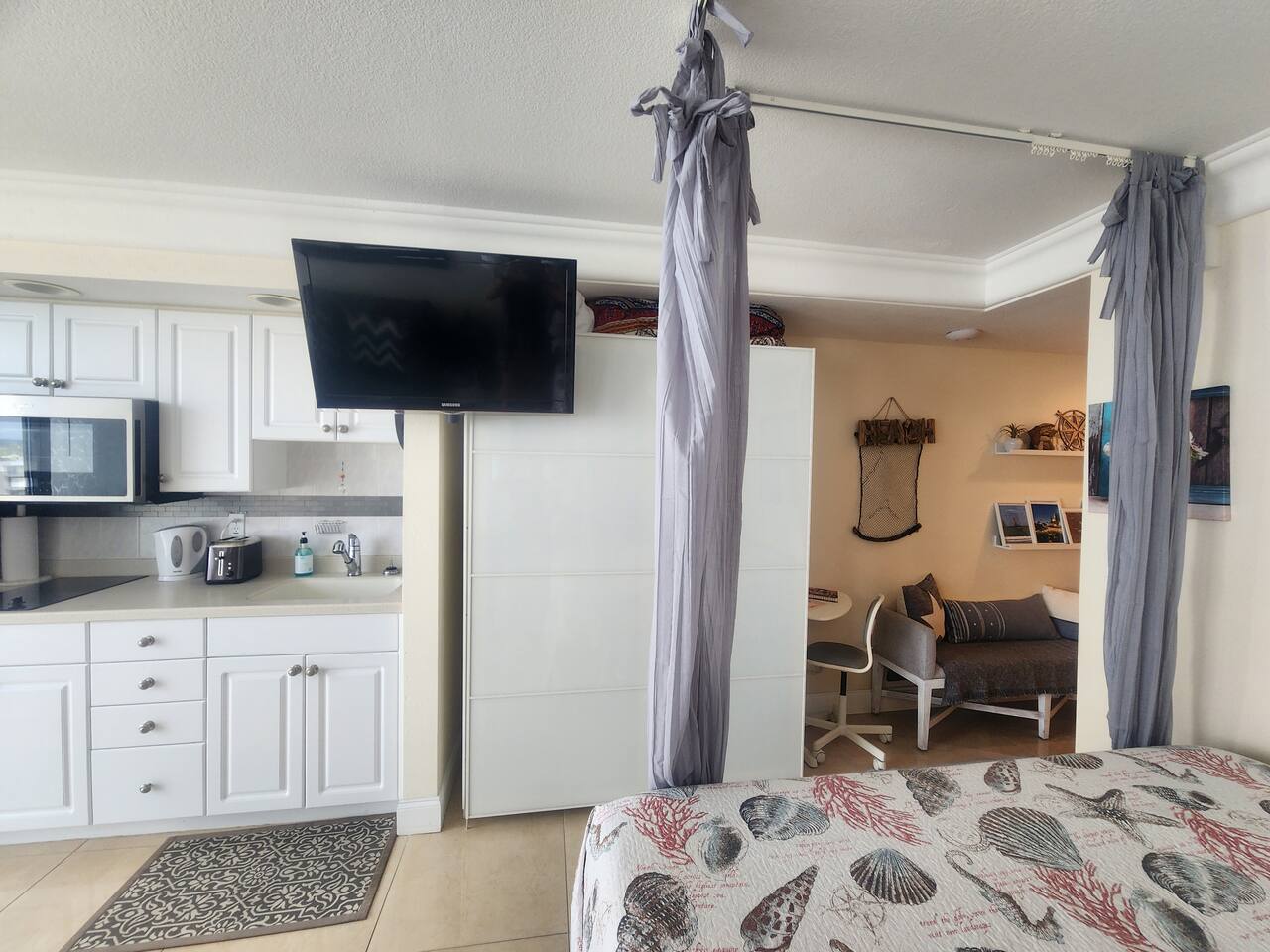 Cozy studio with an upgraded California King Bed. Cook your meals in our large full kitchen stocked with all the necessities or go to any of our local hot spots for your meals. Juliette balcony for either standing room to catch the ocean view or the sunset, or take a chair out to sit on.