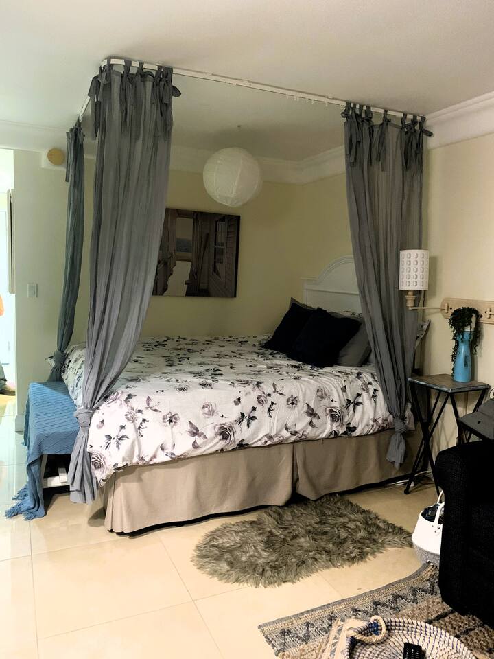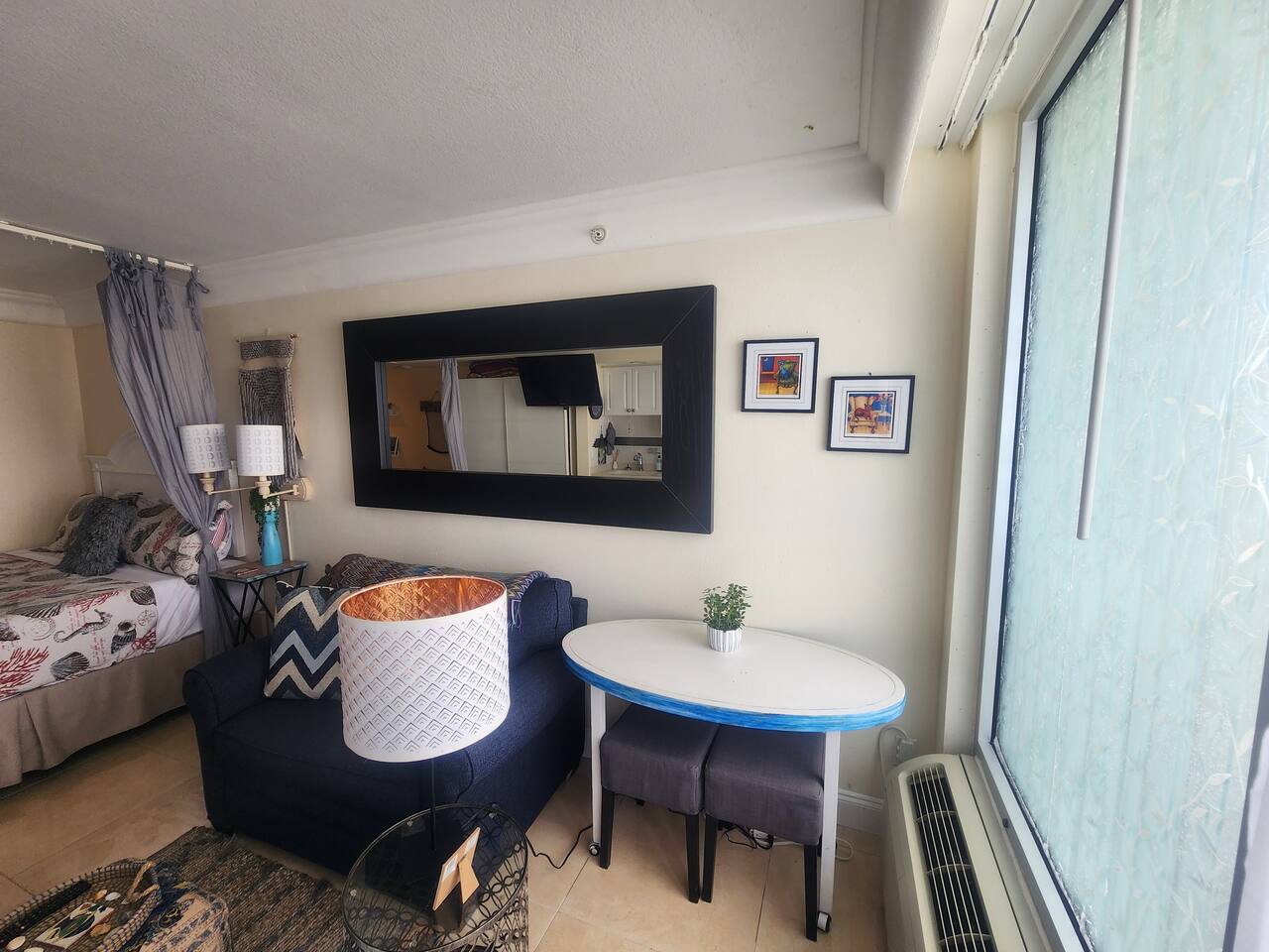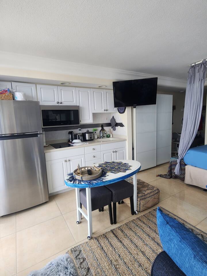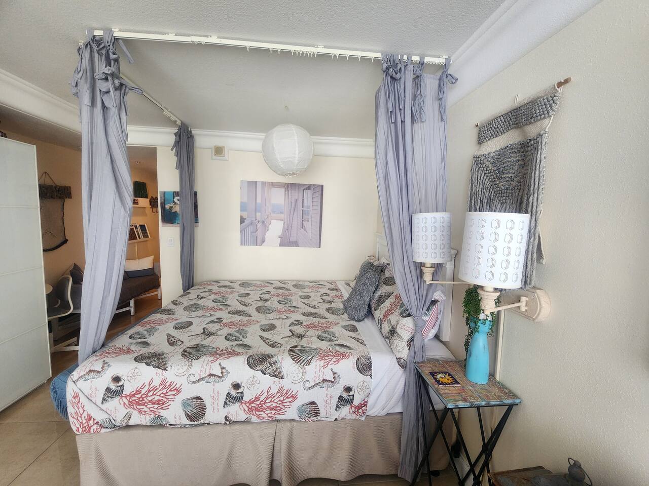 Cozy studio with an upgraded California King Bed. Cook your meals in our large full kitchen stocked with all the necessities or go to any of our local hot spots for your meals. Juliette balcony for either standing room to catch the ocean view or the sunset, or take a chair out to sit on.