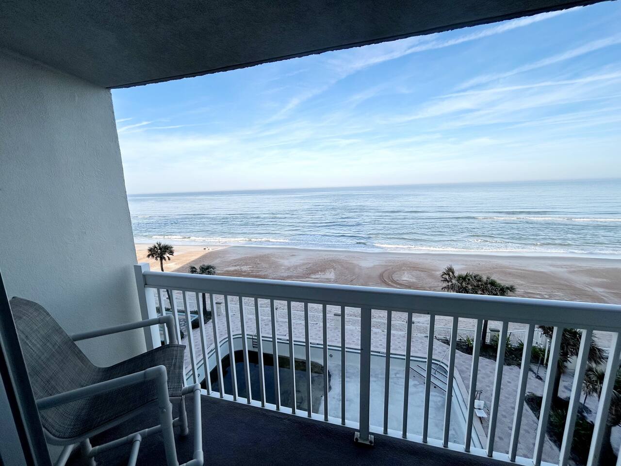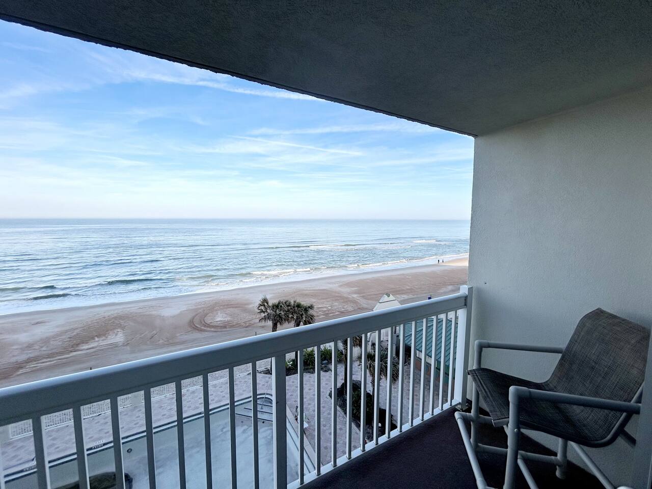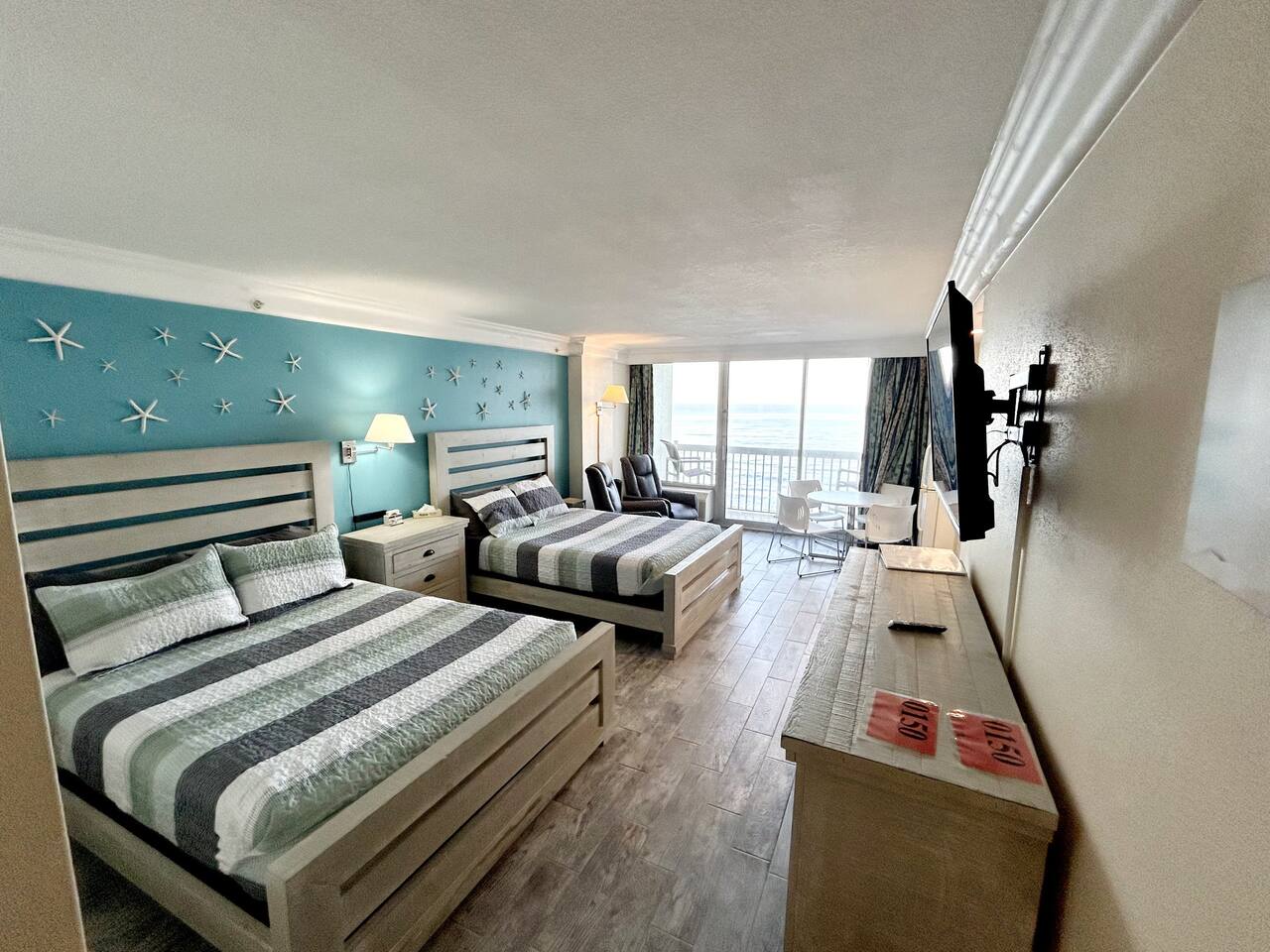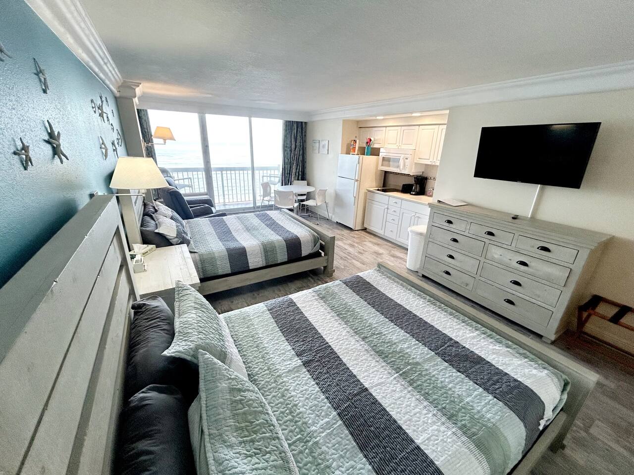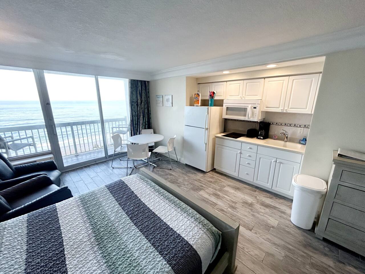 Direct oceanfront studio w/2 queen beds, private balcony, kitchen, all with views of the Atlantic Ocean. Watch the sun rise from your private balcony. Studio has fully equipped kitchen w/coffee maker, toaster, microwave, 2 burner stove, full sized refrigerator & all necessities to cook meals. The unit is located across the street from a large shopping plaza with a grocery store, Walgreens, dining options and retail shops. Just a 20 minute drive to Daytona International Speedway.