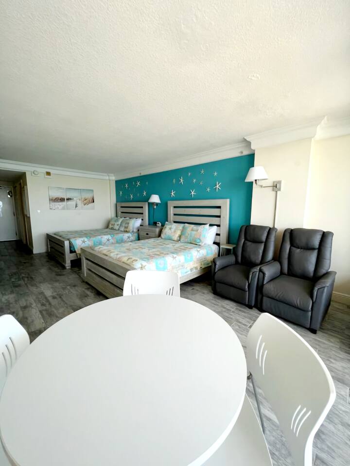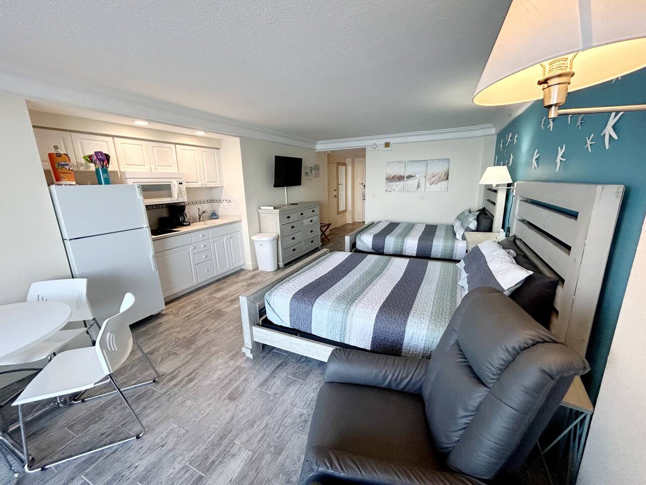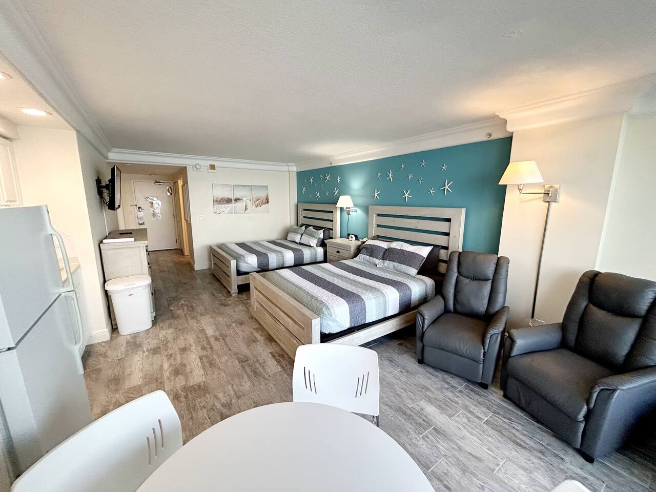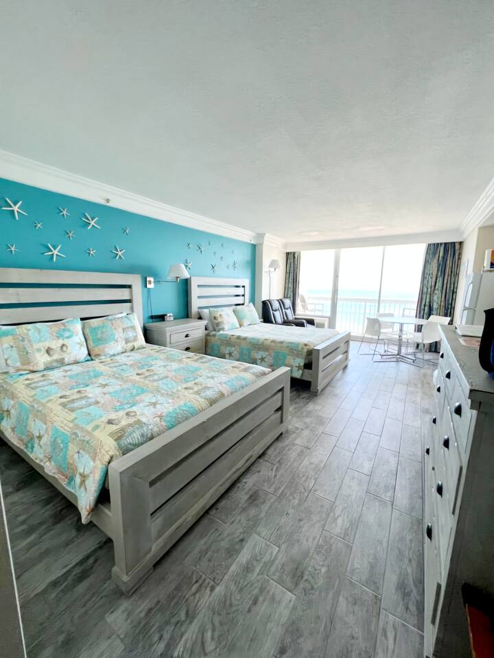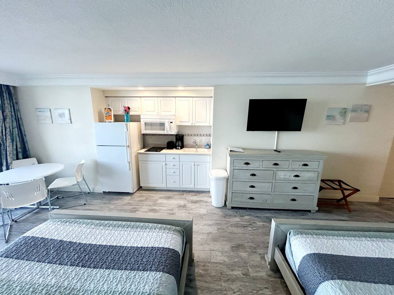 Direct oceanfront studio w/2 queen beds, private balcony, kitchen, all with views of the Atlantic Ocean. Watch the sun rise from your private balcony. Studio has fully equipped kitchen w/coffee maker, toaster, microwave, 2 burner stove, full sized refrigerator & all necessities to cook meals. The unit is located across the street from a large shopping plaza with a grocery store, Walgreens, dining options and retail shops. Just a 20 minute drive to Daytona International Speedway.