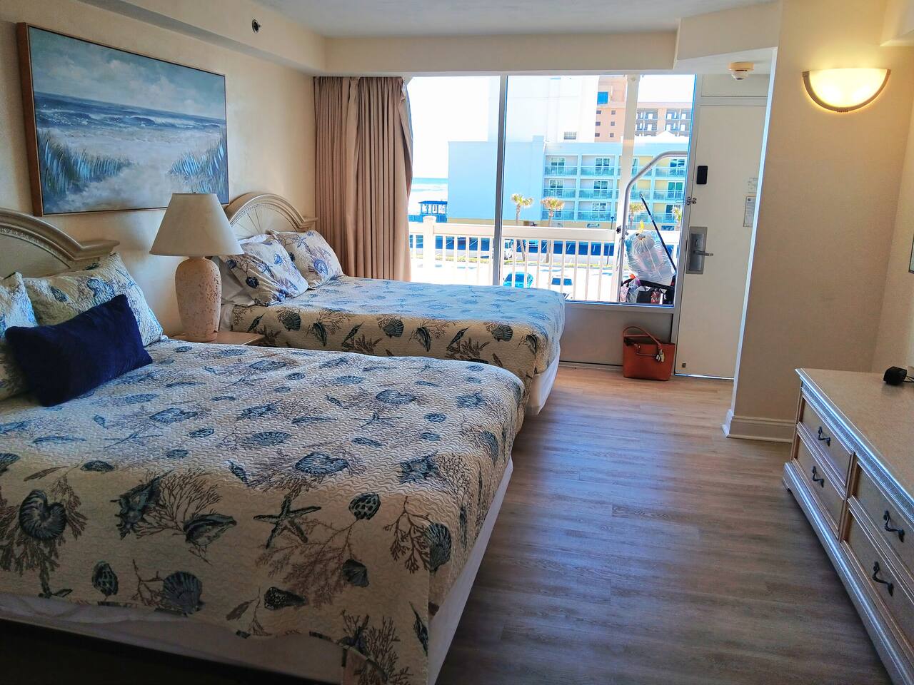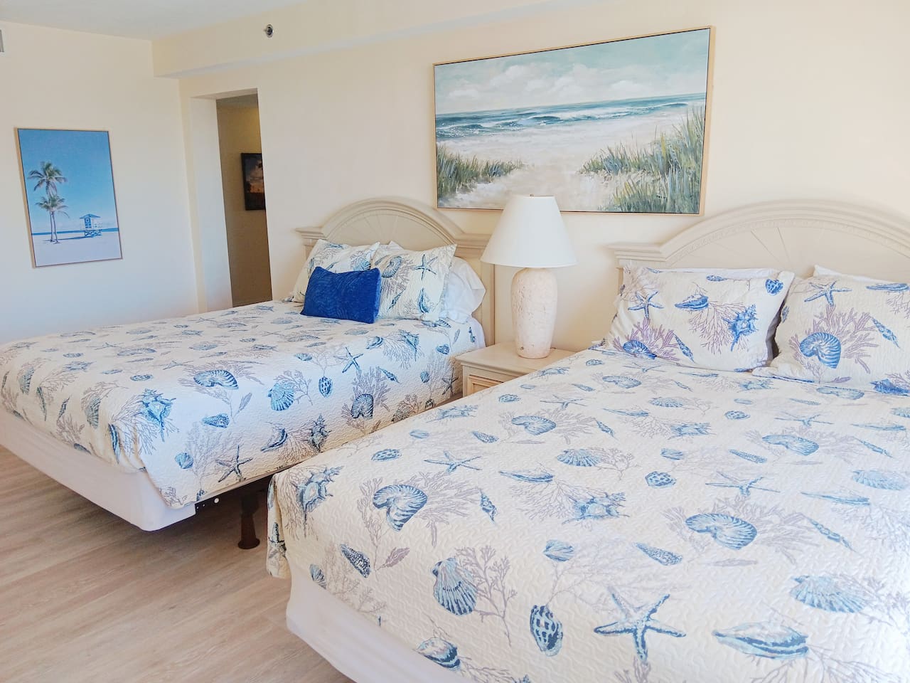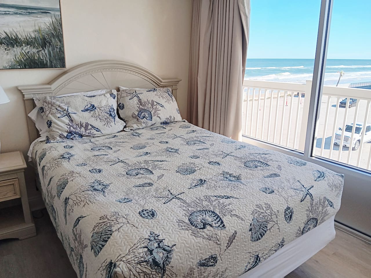Wake up to the sound of rolling waves & enjoy unobstructed ocean vistas from your private balcony in this large 1-bedroom, direct oceanfront condo. The bedroom features 2 comfortable queen beds w/premium linens, accompanied by a large TV for entertainment. The living area has an open floor plan with kitchen area and bar, includes a queen sleeper sofa, smart TV, and ample seating, providing a relaxed atmosphere for families or groups up to 6 guests. Resort has outdoor & indoor pool, hot tub, gym