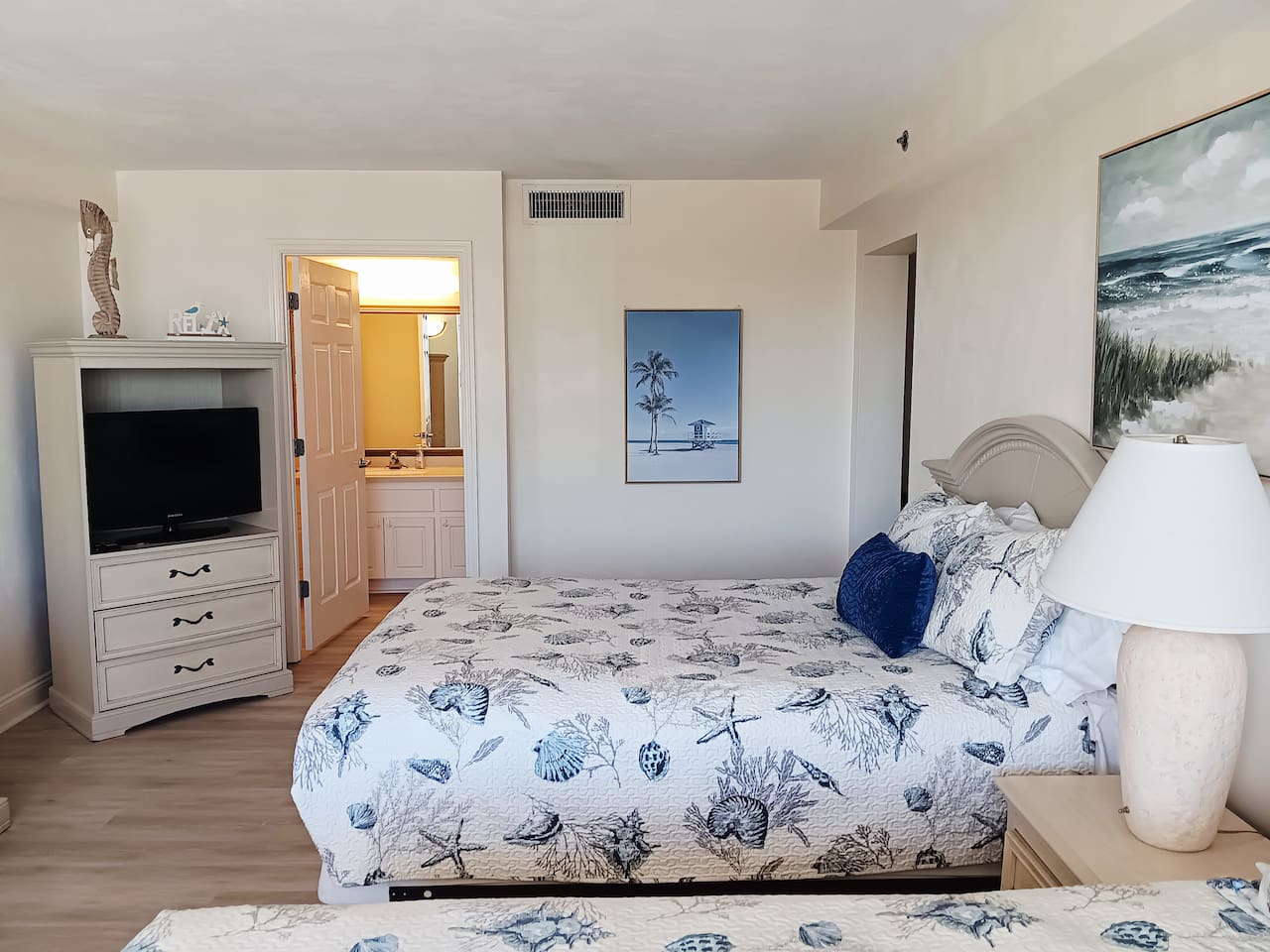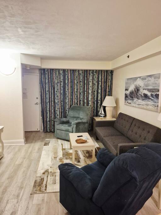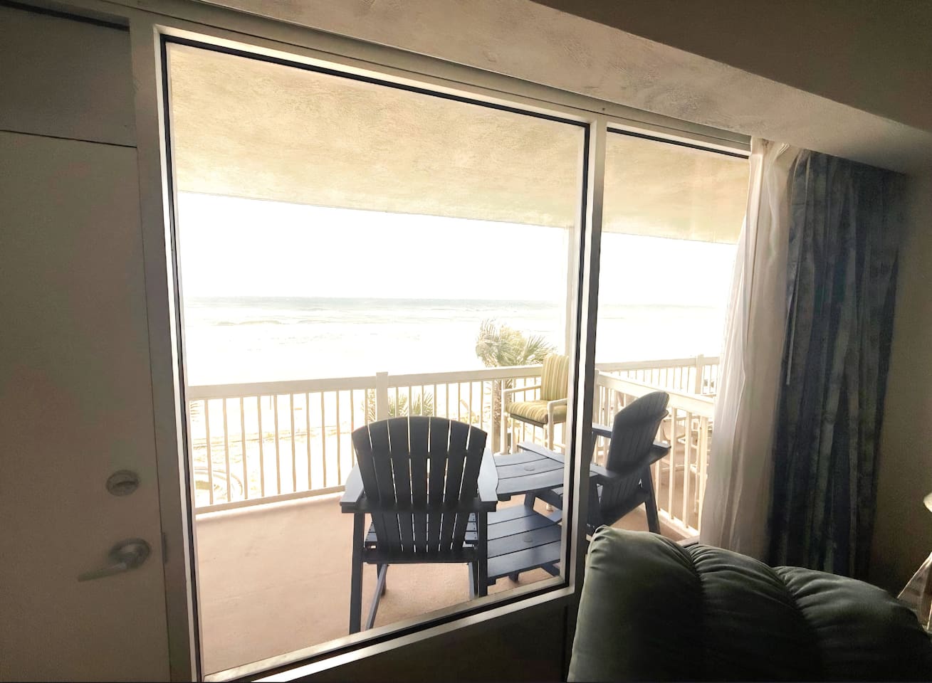 Wake up to the sound of rolling waves & enjoy unobstructed ocean vistas from your private balcony in this large 1-bedroom, direct oceanfront condo. The bedroom features 2 comfortable queen beds w/premium linens, accompanied by a large TV for entertainment. The living area has an open floor plan with kitchen area and bar, includes a queen sleeper sofa, smart TV, and ample seating, providing a relaxed atmosphere for families or groups up to 6 guests. Resort has outdoor & indoor pool, hot tub, gym