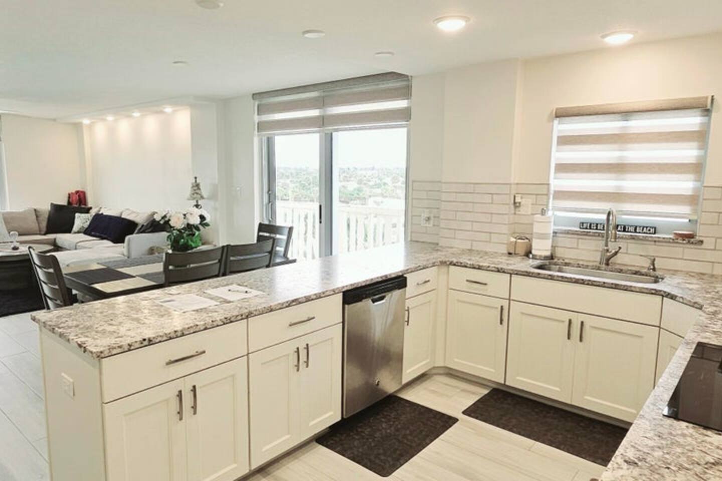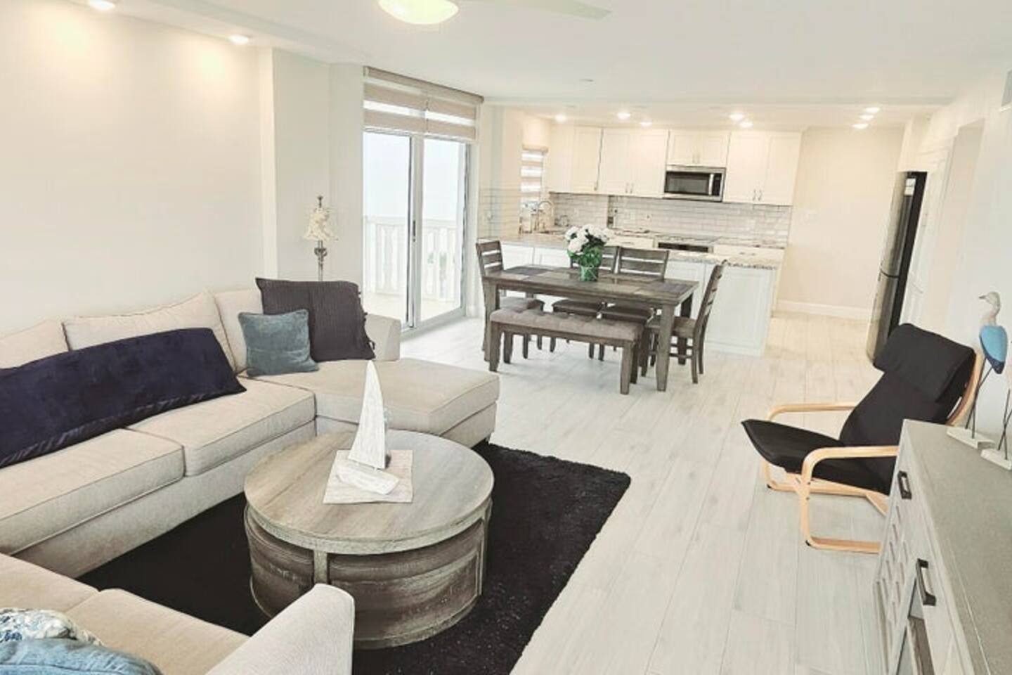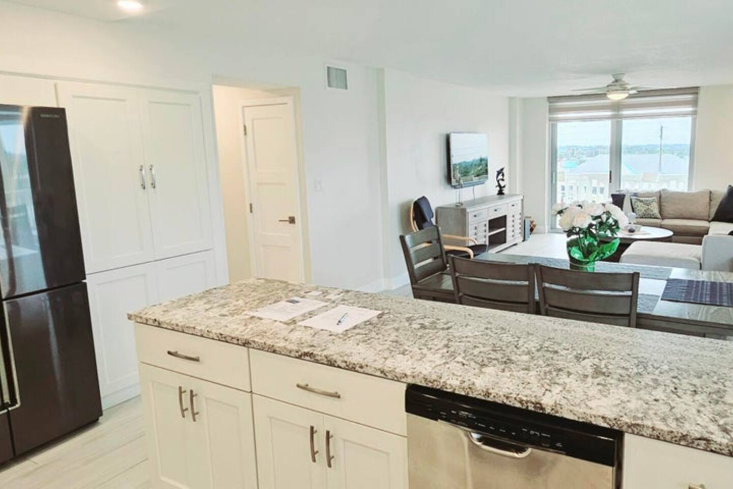 This gorgeous, upgraded condo boasts beautiful granite countertops, stainless appliances, fully stocked kitchen. Views of the Atlantic and also the sunset from the wrap around balcony. Watch the sun come up over the ocean and sip on your evening drink watching the sun set. King Master suite has ensuite bathroom with new tiled shower, large closets. Double queen guest bedroom with full bathroom and smart tv. Living room has private balcony, smart TV. Open floor plan from kitchen, dining room, living room.