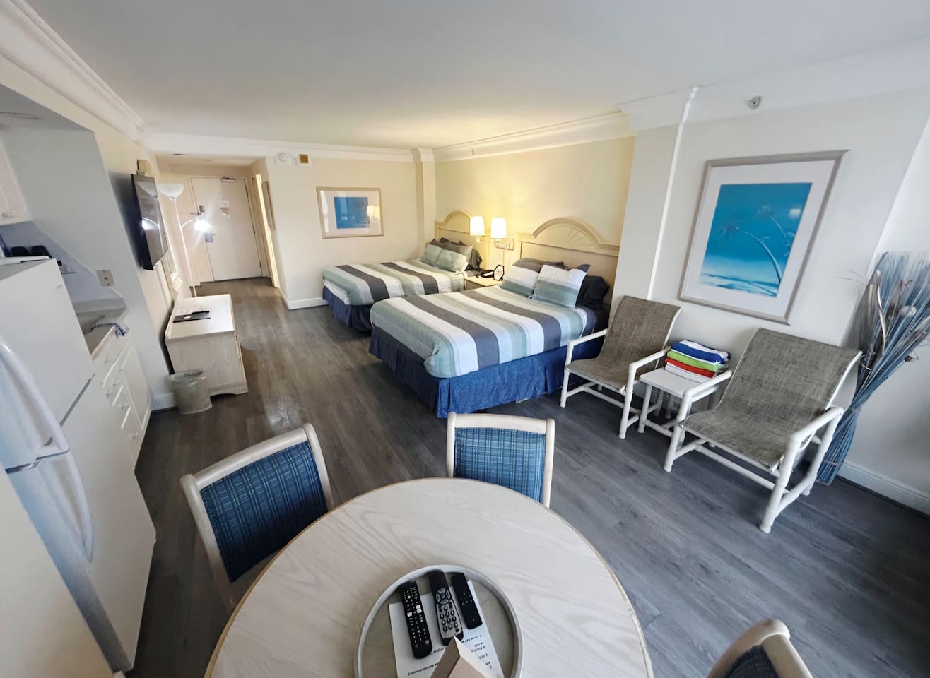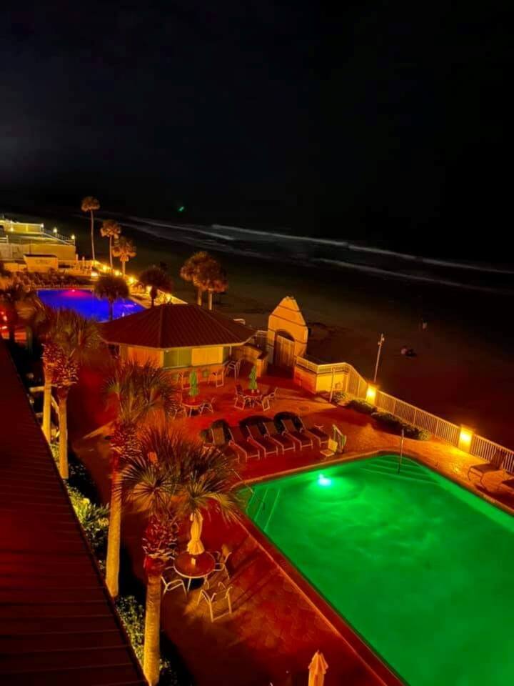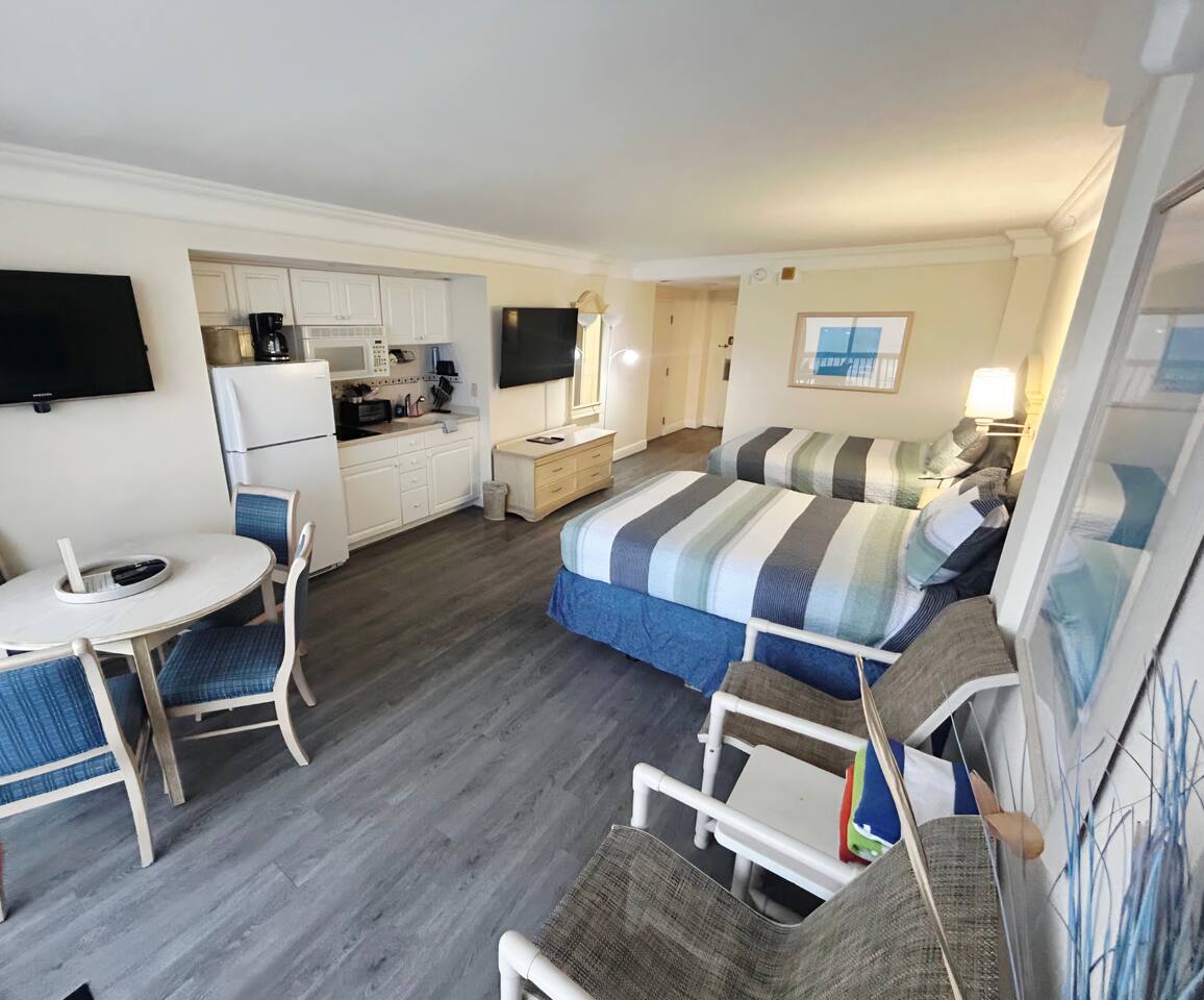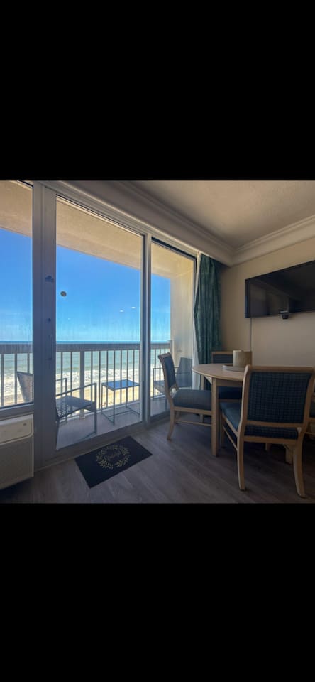 Enjoy the Surf N Sun in this direct oceanfront studio w/private balcony, kitchen. Located in a resort with heated indoor pool,, hot tub, heated outdoor pool, fitness center, sauna. Studio has 2 queen sized beds, 2 smart TVs, kitchenette w/2 burner cooktop, full sized fridge, microwave, coffemaker, toaster, and all the necessary cookware and dishes needed. Resort is located across the street from large shopping plaza with grocery, retail shops, restaurants, Walgreens and much more!